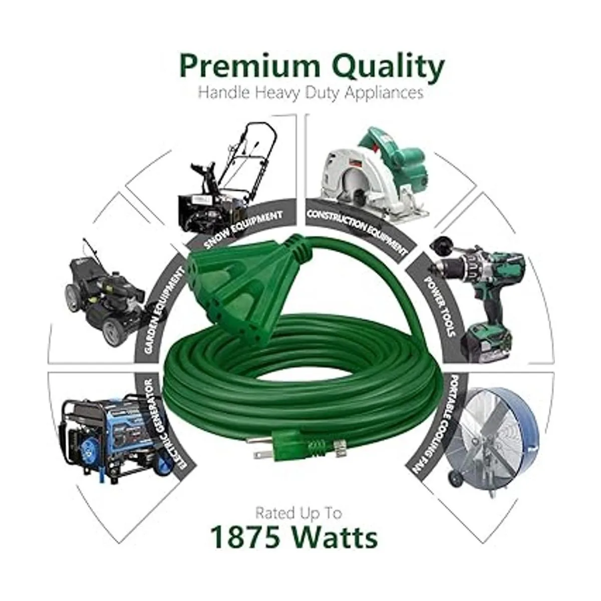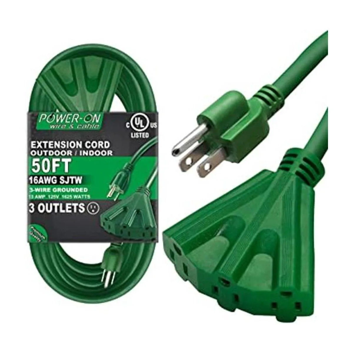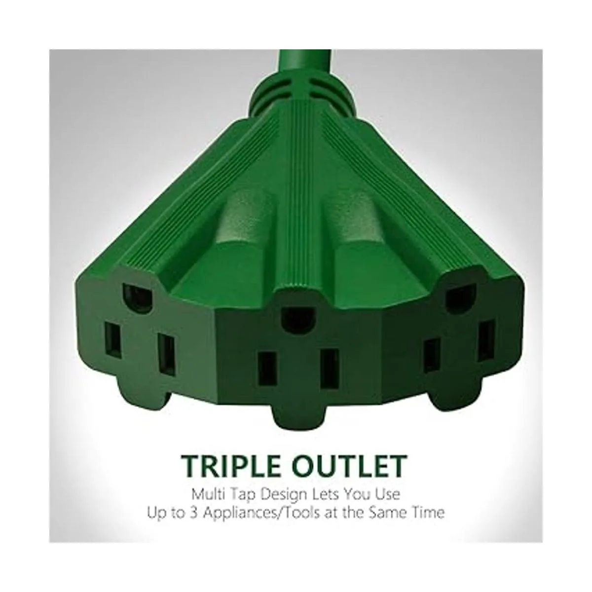 Kasonic Cable de extensión de 50 pies con 3 tomas, certificación UL SJTW de 3 cables con conexión a tierra, 13A 125V 1625W para uso en interiores y exteriores, color verde