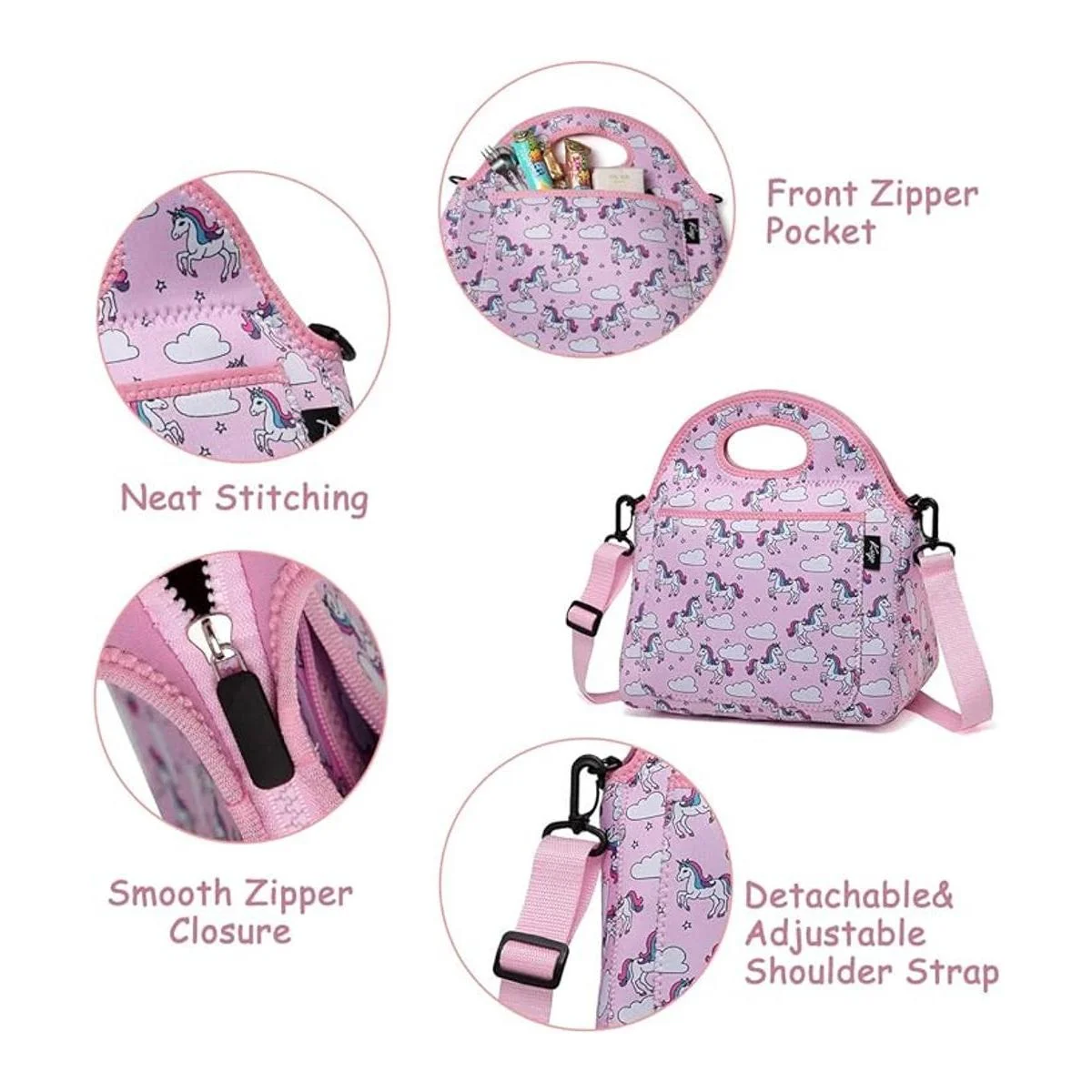 KASQO Lonchera de neopreno para niñas, con bolsillo frontal y correa de hombro ajustable desmontable, unicornio rosa