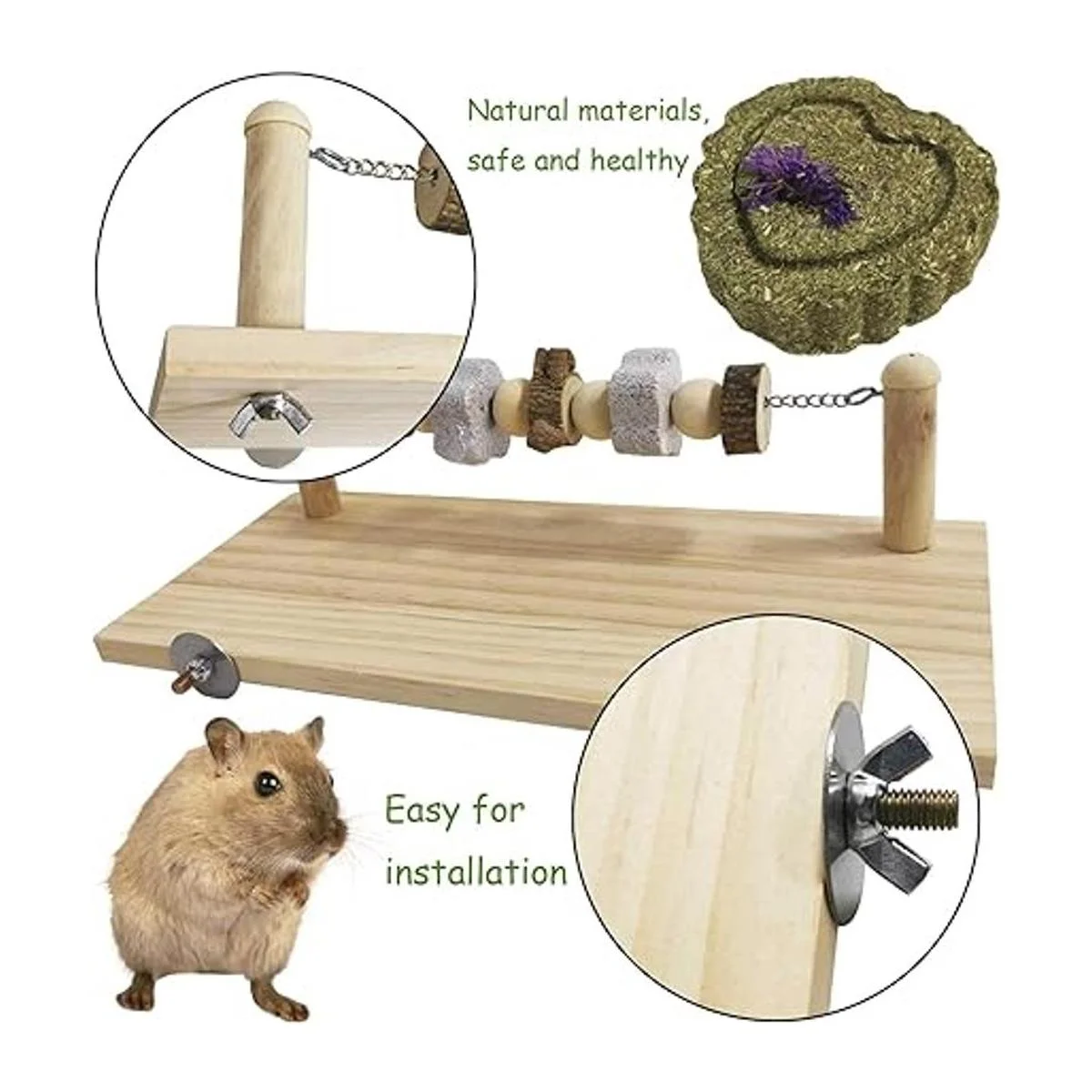 Material seguro: la plataforma de madera está hecha de madera natural y roca volcánica natural, que es segura para tu pequeña mascota, también contiene juntas y tuercas, fácil de instalar, no requiere herramientas adicionales. Los pasteles de césped en forma de corazón están hechos de hierba Timothy y y alfalfalfa, seguridad y salud.