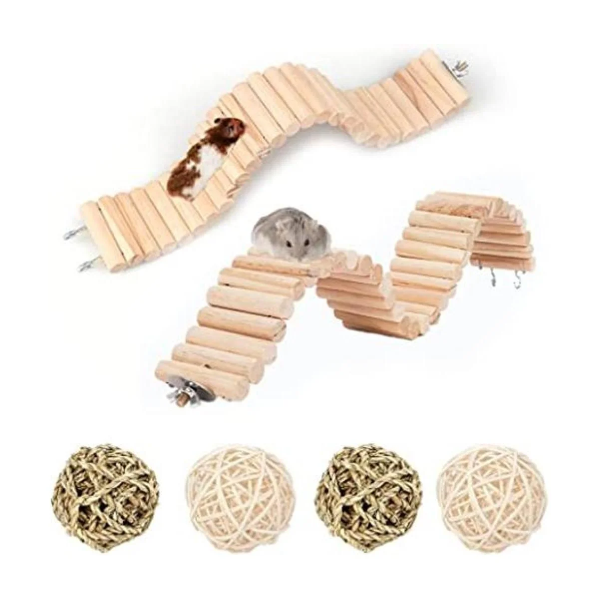 kathson Puente de escalera de suspensión de hámster de madera, escaleras largas y flexibles, accesorios de juguete, 2 piezas, 4 bolas de masticar naturales para ratón, conejos y otros animales pequeños