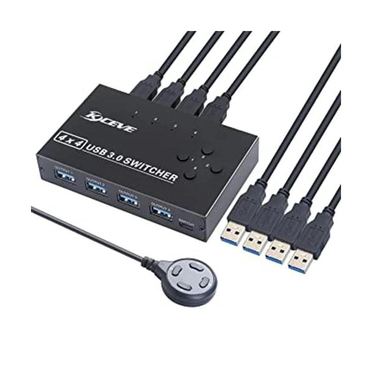 KCEVE Conmutador USB 3.0, selector de conmutador USB 4 para compartir computadoras, 4 dispositivos USB, caja de conmutador KVM para impresora compartida, escáner, mouse, teclado, compatible con MacWindowsLinux, con paquete de 4 cables USB 3.0