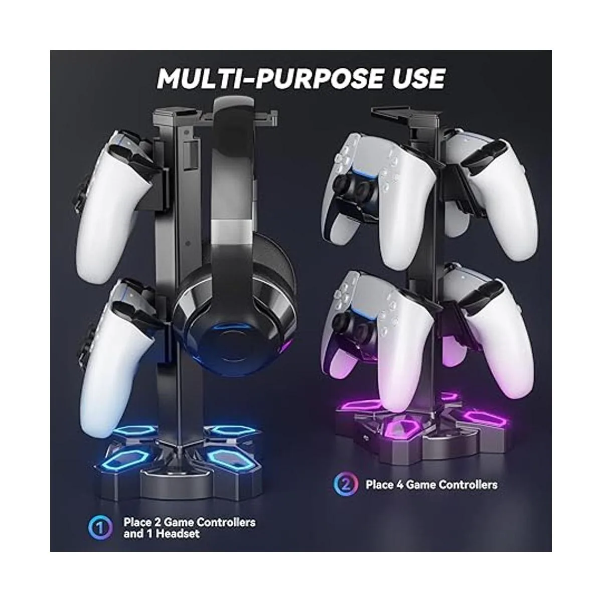 Soporte giratorio para auriculares y soporte para controlador desmontable Puede contener un auricular y dos controladores al mismo tiempo, o cuatro controladores de juego. Adecuado para todos los tamaños de auriculares de marca y compatible con una amplia variedad de controladores. La goma protectora suave evita arañazos o daños en tus dispositivos.