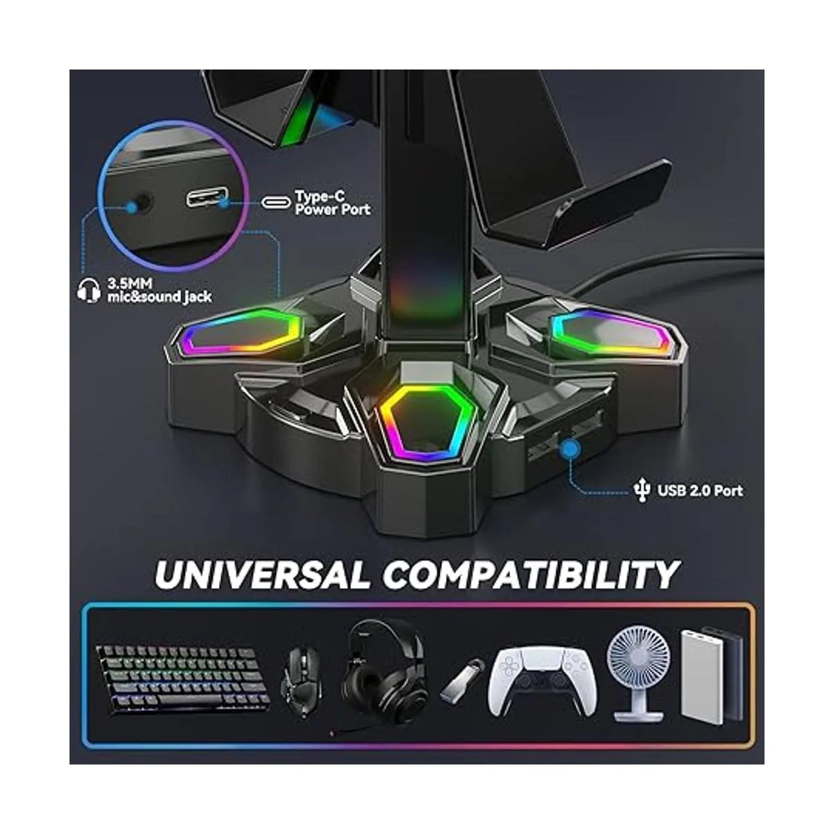 KDD Soporte para auriculares RGB para juegos, soporte giratorio para auriculares con 9 modos de luz, soporte para controlador con 2 puertos de carga USB y puerto tipo C de 0.138 in y puerto tipo C, accesorios para colgar auriculares para jugadores de escritorio negro