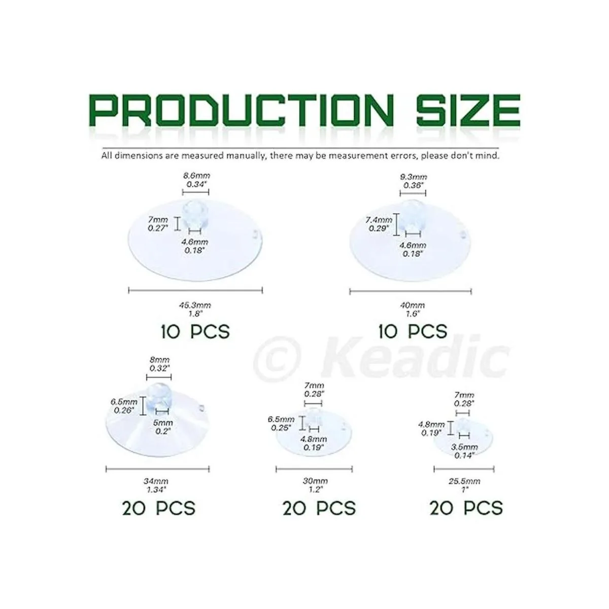 Juego surtido de ventosas: el juego de ventosas transparentes contiene 20 ventosas de goma de 1.0 in, 20 ventosas de goma de 1.2 in, 20 ventosas de goma de 1.4 in, 10 ventosas de goma de 1.6 in, 10 ventosas de goma de 1.8 in, 80 piezas en total. Varios tamaños y cantidad suficiente para tu repuesto y reemplazo en aplicaciones domésticas.