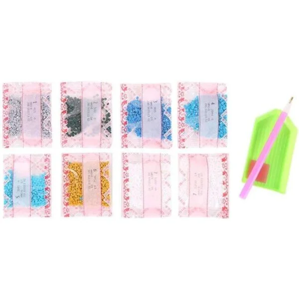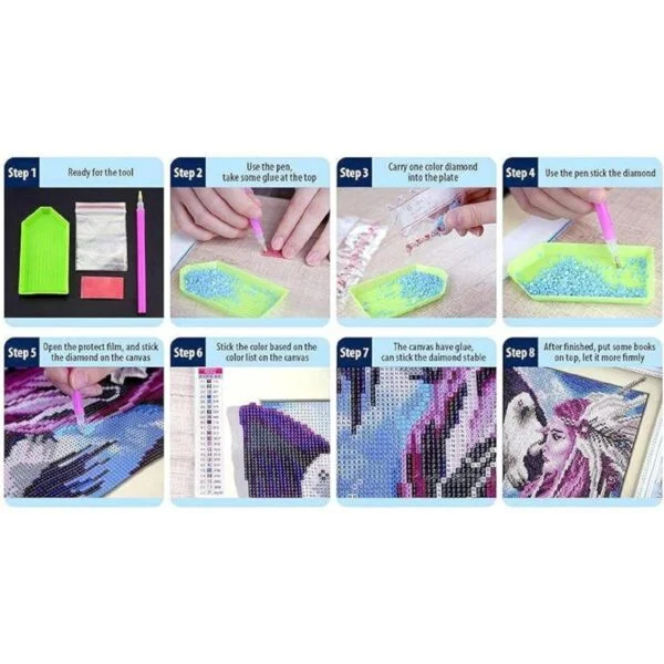 Lo que obtienes: 1 lienzo impreso de alta definición, suficientes cuentas de diamante, 1 barro de pintura, 1 bolígrafo de puntos de diamante y 1 placa.