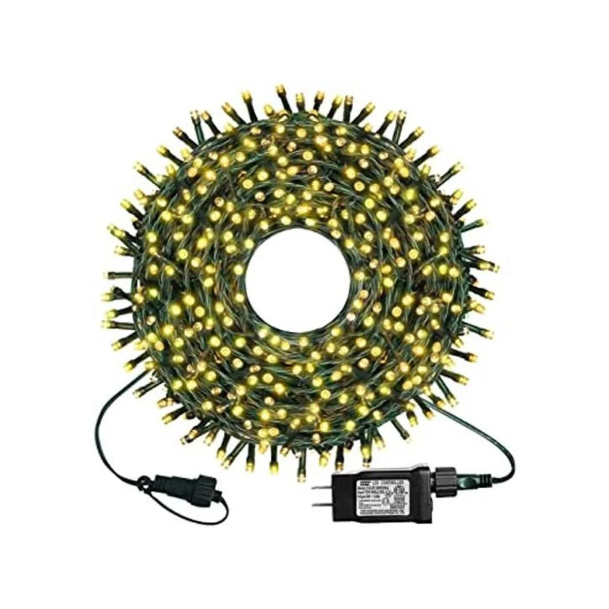 Cadena de luces de alambre verde de 98.5 pies con 300 bombillas LED individuales de color blanco cálido. Cada luz tiene conexión de extremo a extremo, puedes conectar hasta 4 juegos juntos para iluminar un rango más amplio.