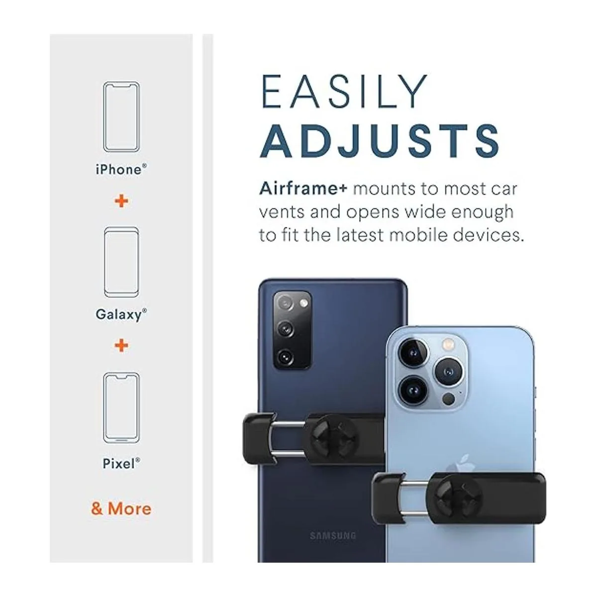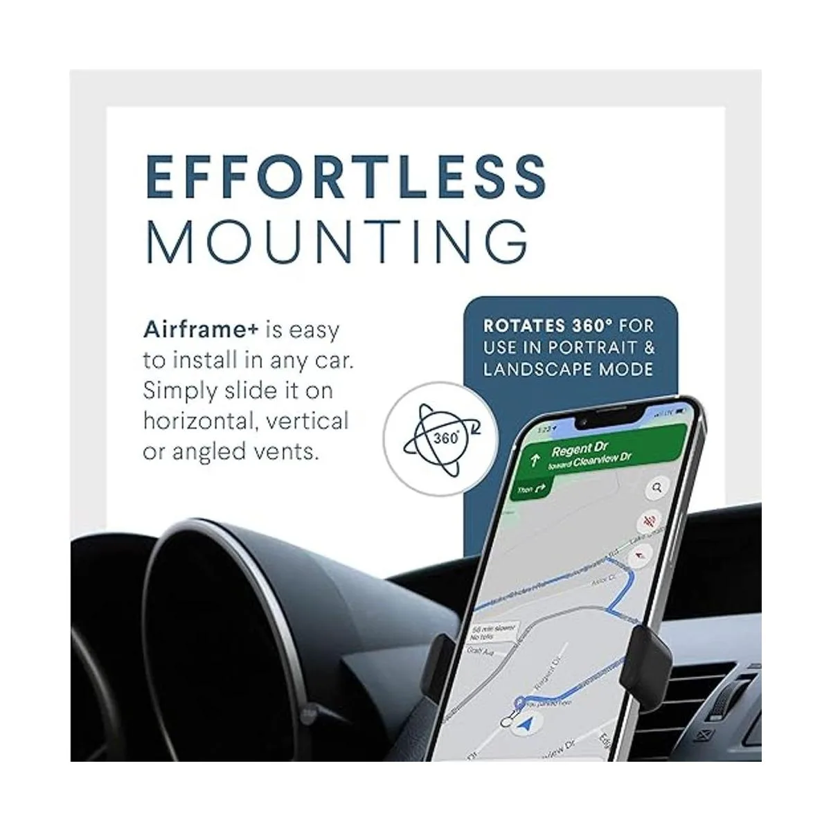 Vent Versatility Our patented design US Utility Patent 9,080,714 uses a rotating clip that securely mounts Airframe onto many vents horizontal, vertical, and angled. You can rotate the back clip between the thin and thick vent settings.
