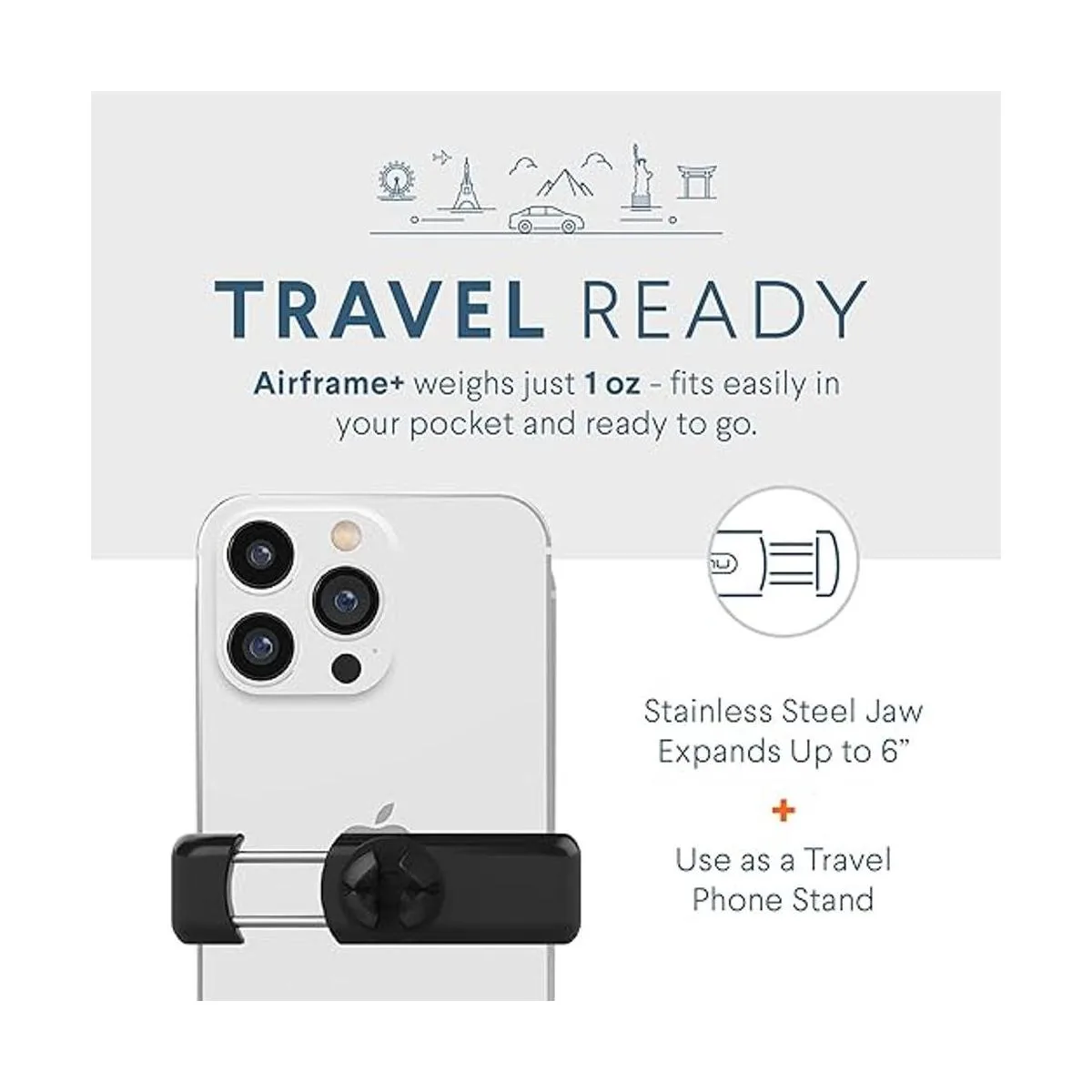 Travel Stand Insert any card from your wallet into the rotating clip and Airframe transforms into the ultimate Android or iPhone stand. Great for travel and use on Airplanes.