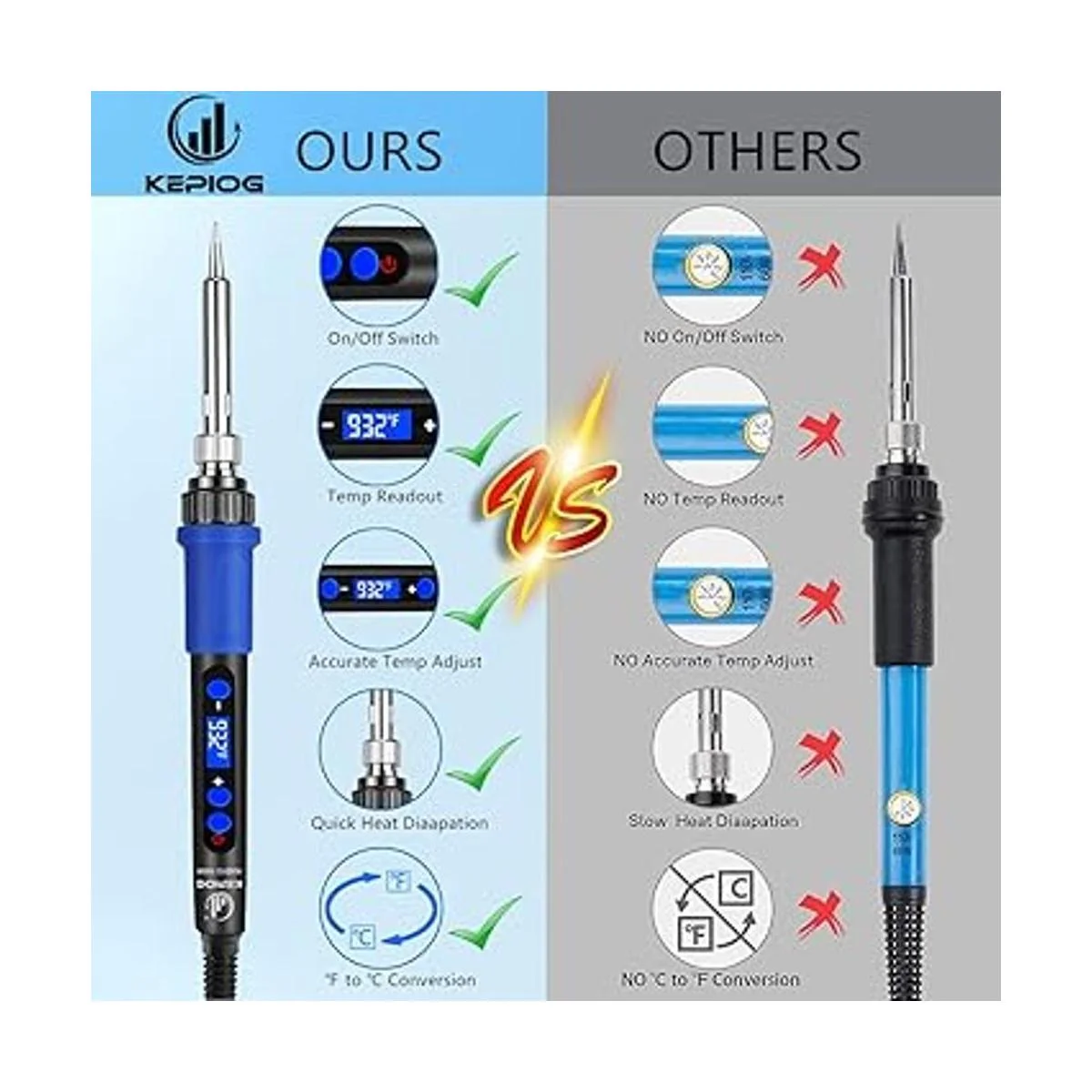 Soldador termostático con pantalla digital: el pequeño tamaño de la plancha, peso ligero, fácil de llevar. Velocidad de calentamiento rápida y control preciso de la temperatura, la temperatura de trabajo se puede alcanzar dentro de 20 segundos, la temperatura se puede ajustar entre 392.0 F932.0 F.
