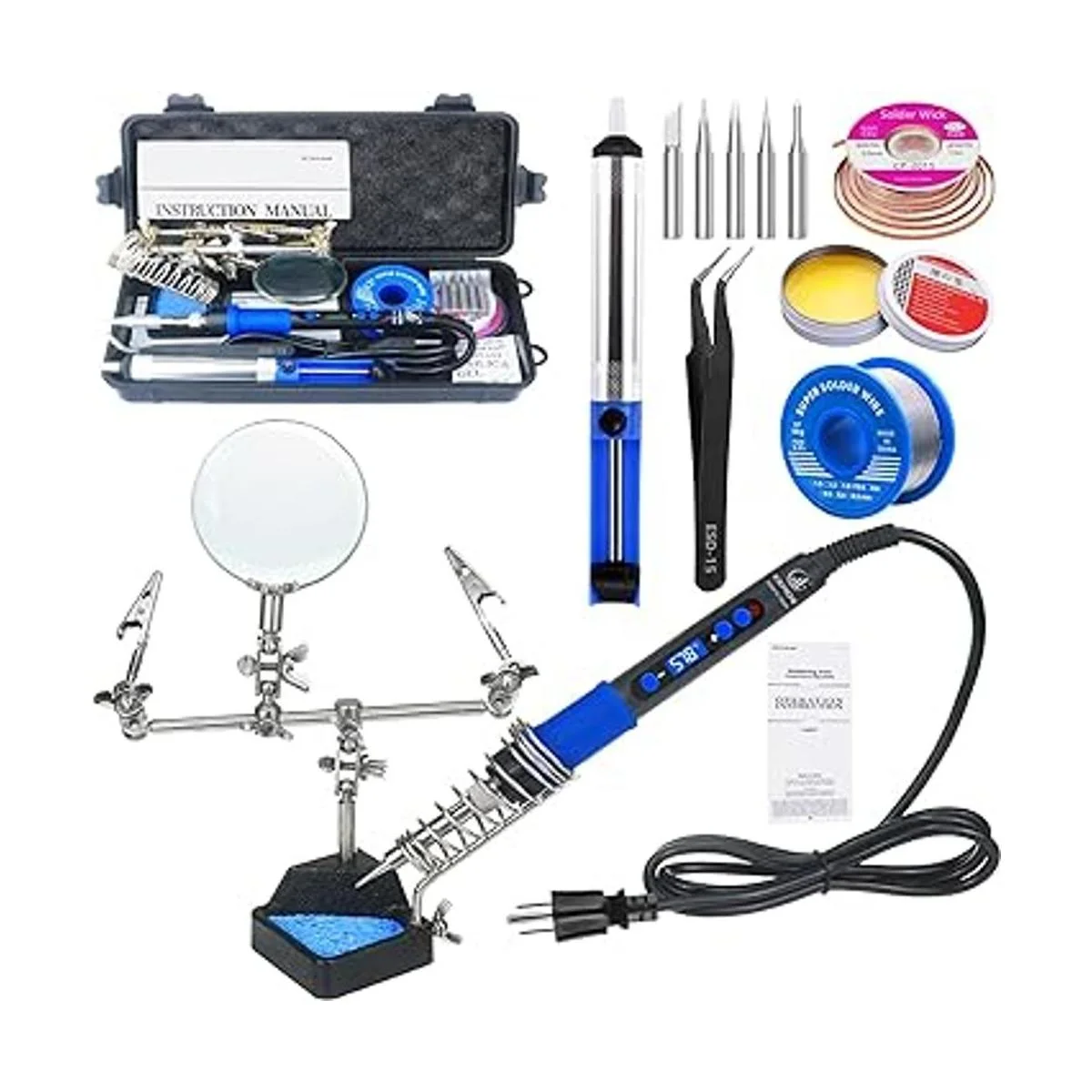 Kit completo de soldadura: el paquete incluye soldador digital de 100 W, soporte de soldadura, 5 puntas de soldador diferentes, alambre de soldadura de 1.76 oz de 0.031 in, bomba desoldadora, pasta de soldadura, desoldadora y pinzas, etc. Un conjunto de herramientas de soldadura profesionales para satisfacer las necesidades diarias de soldadura de los entusiastas de la electrónica.