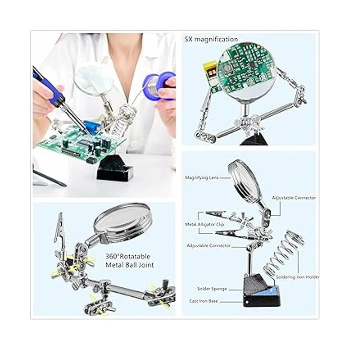 Soporte de soldadura con lupa : la lupa puede ayudarte a soldar piezas pequeñas más claramente. Los clips de cocodrilo pueden ayudarte a fijar la pieza a soldar sin preocuparte de que se incline o se mueva.