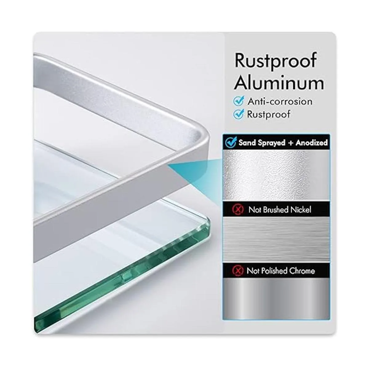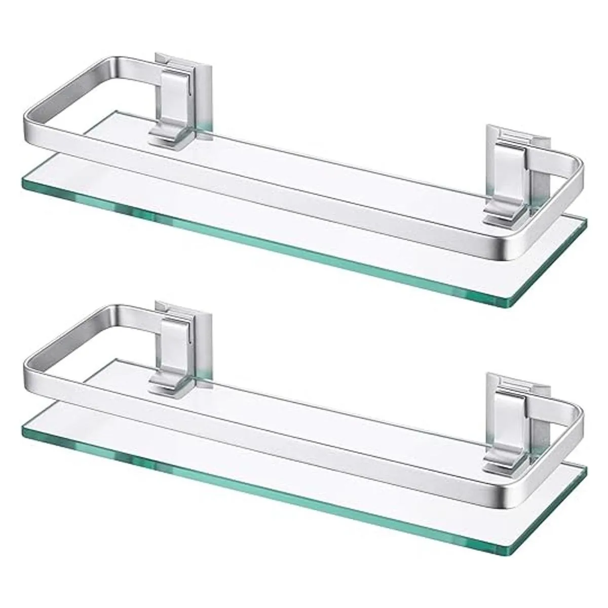 KES Estante de vidrio para baño, vidrio templado de aluminio, 0.315 in, extra grueso, paquete de 2 unidades rectangulares de 1 nivel, organizador de almacenamiento para montaje en pared, color plateado, A4126AP2