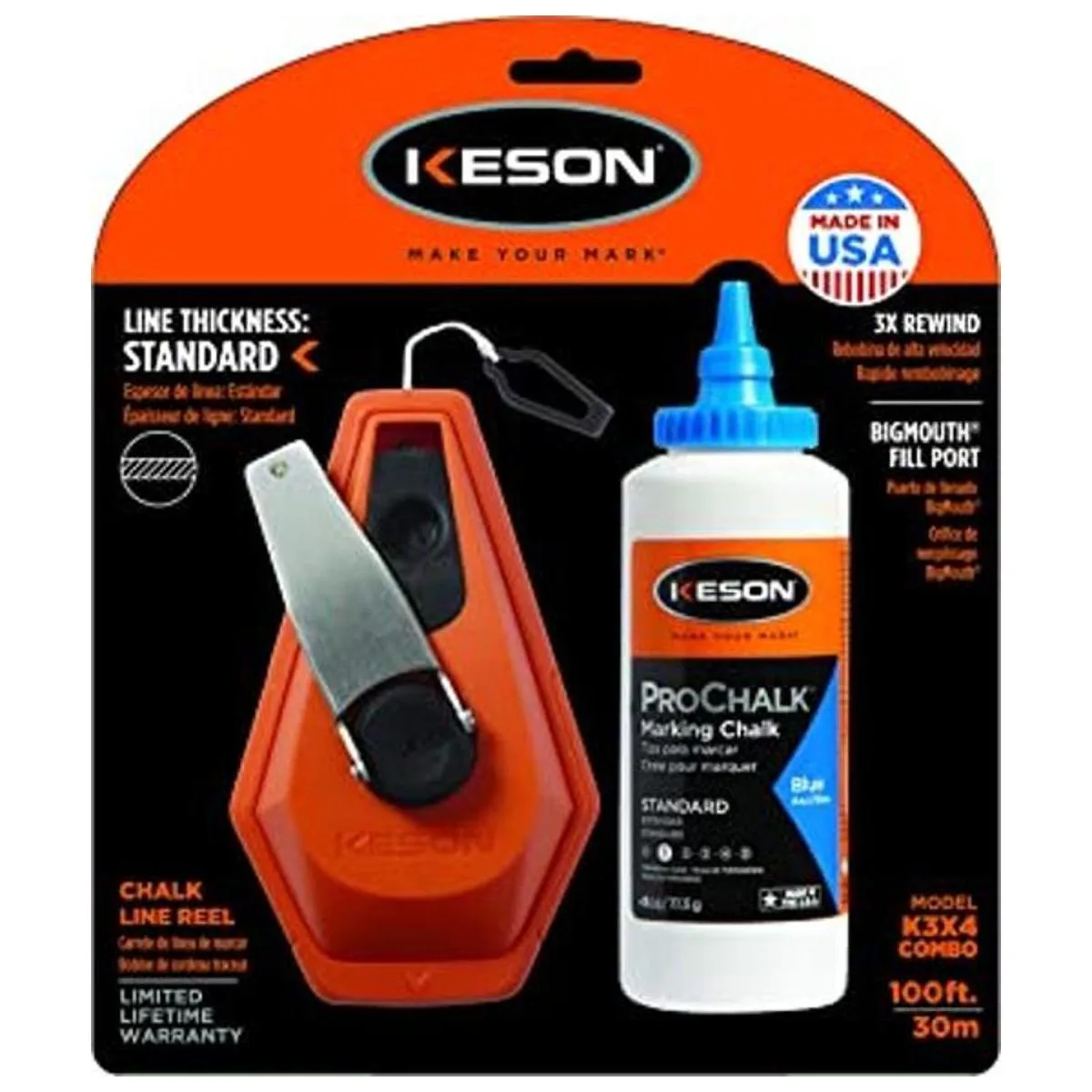 Keson K3X4B 3 x 1 carrete de línea de tiza de rebobinado con 4 onzas de tiza azul, 100 pies
