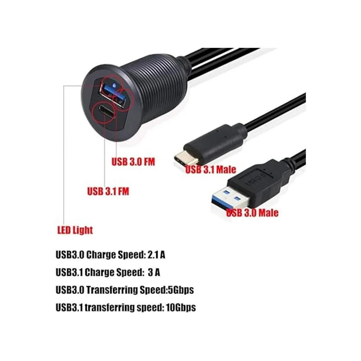 Kework Metal Shell USB 3.0 puerto y USB tipo C puerto de montaje con luz, 3.3 pies USB 3.0 y USB 3.1 macho a hembra Cable de extensión para montaje en panel empotrado para coche, camión, barco, motocicleta gris y 3.3 pies