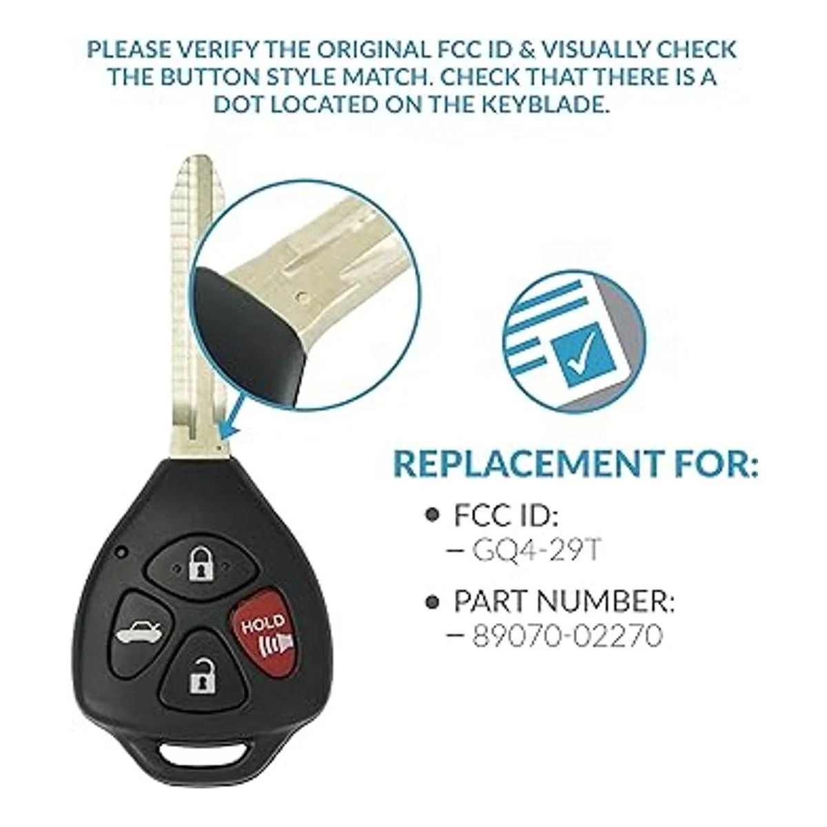 Este es un llavero de repuesto de cabeza remota con hoja de llave sin cortar para vehículos seleccionados Toyota Avalon y Corolla; reemplazo para números de pieza Toyota: 8907002270, GQ429T, GQ429T. Consulta la descripción del producto para ver la guía de ajuste del vehículo.