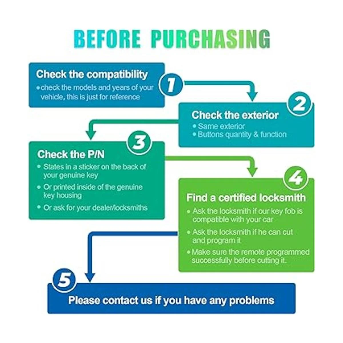 Verificación La compatibilidad es solo para referencia, por favor confirma que tu identificación FCC, número de pieza OEM, botones remotos y hoja de llave de tu llave original son idénticos a este control remoto inteligente antes de comprar.