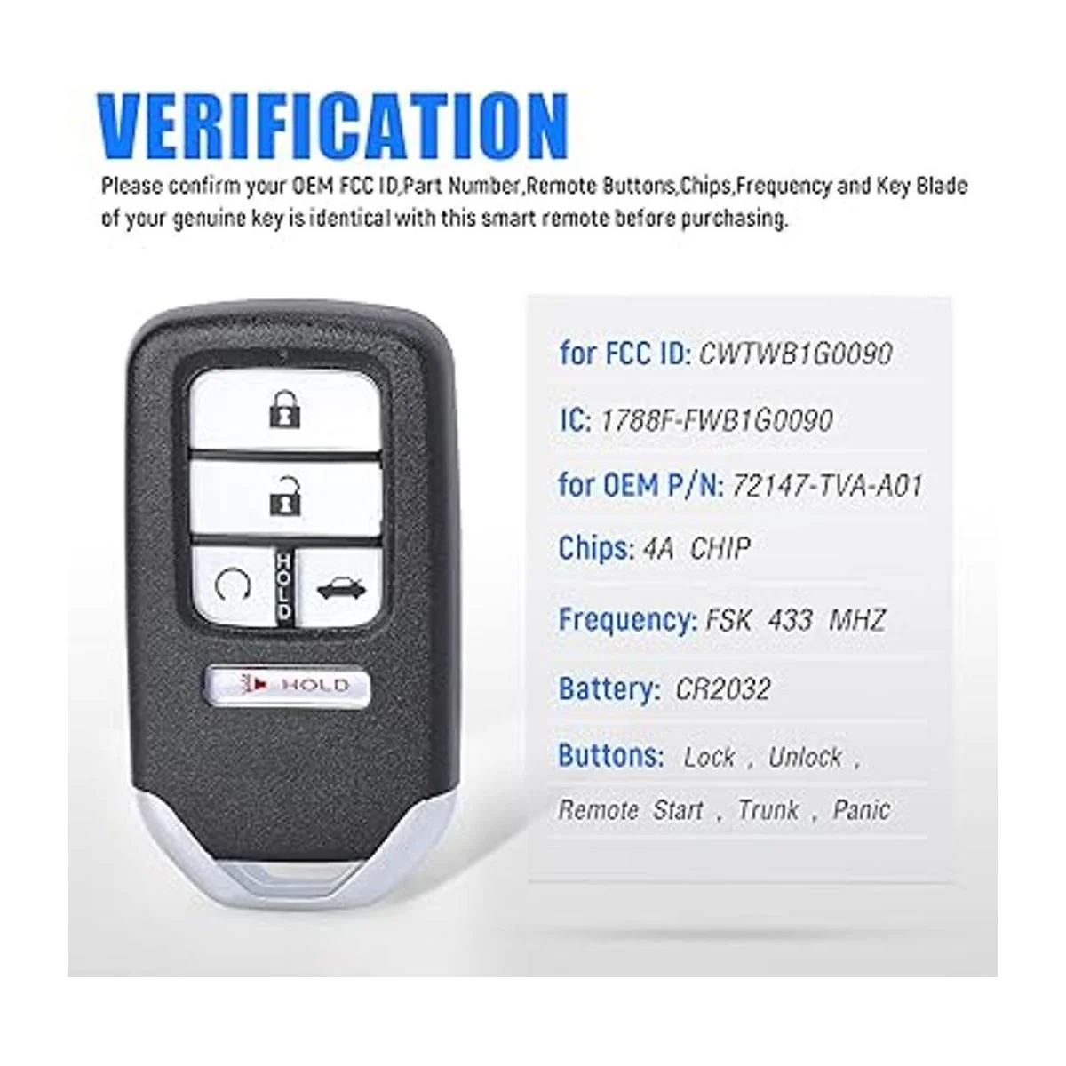 Keymall Llave inteligente de repuesto para Honda Accord 2018 2019 2020 FCC IDCWTWB1G0090 PN 72147TVAA01 5 botones