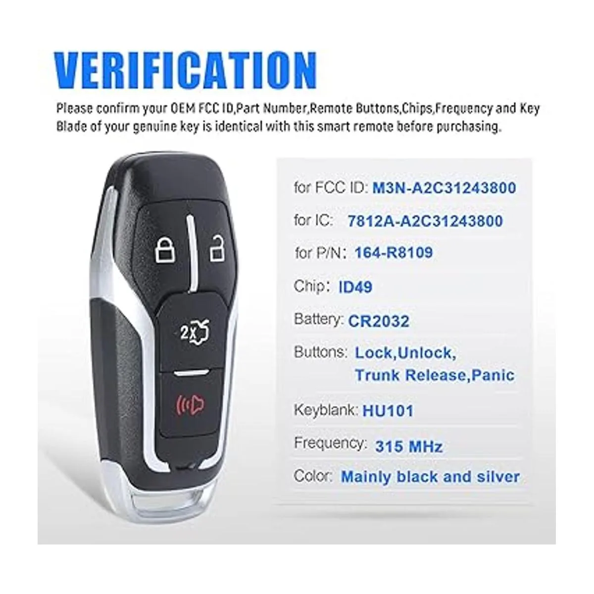 Keymall Mando a distancia de entrada sin llave para Ford Fusion Edge Explorer 2015 2016 2017 ID49 Chip 4 botones ID FCC M3NA2C31243800 PN 164R8109
