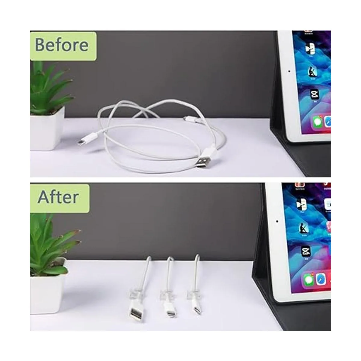Clips de gestión de cables: con el diseño de base autoadhesiva, estos clips de cable se pueden fijar firmemente en superficies lisas, aportando mucha comodidad en la vida diaria; ayudan a mantener tu lugar limpio y organizado, y deshacerse de la molestia de los cables desordenados.
