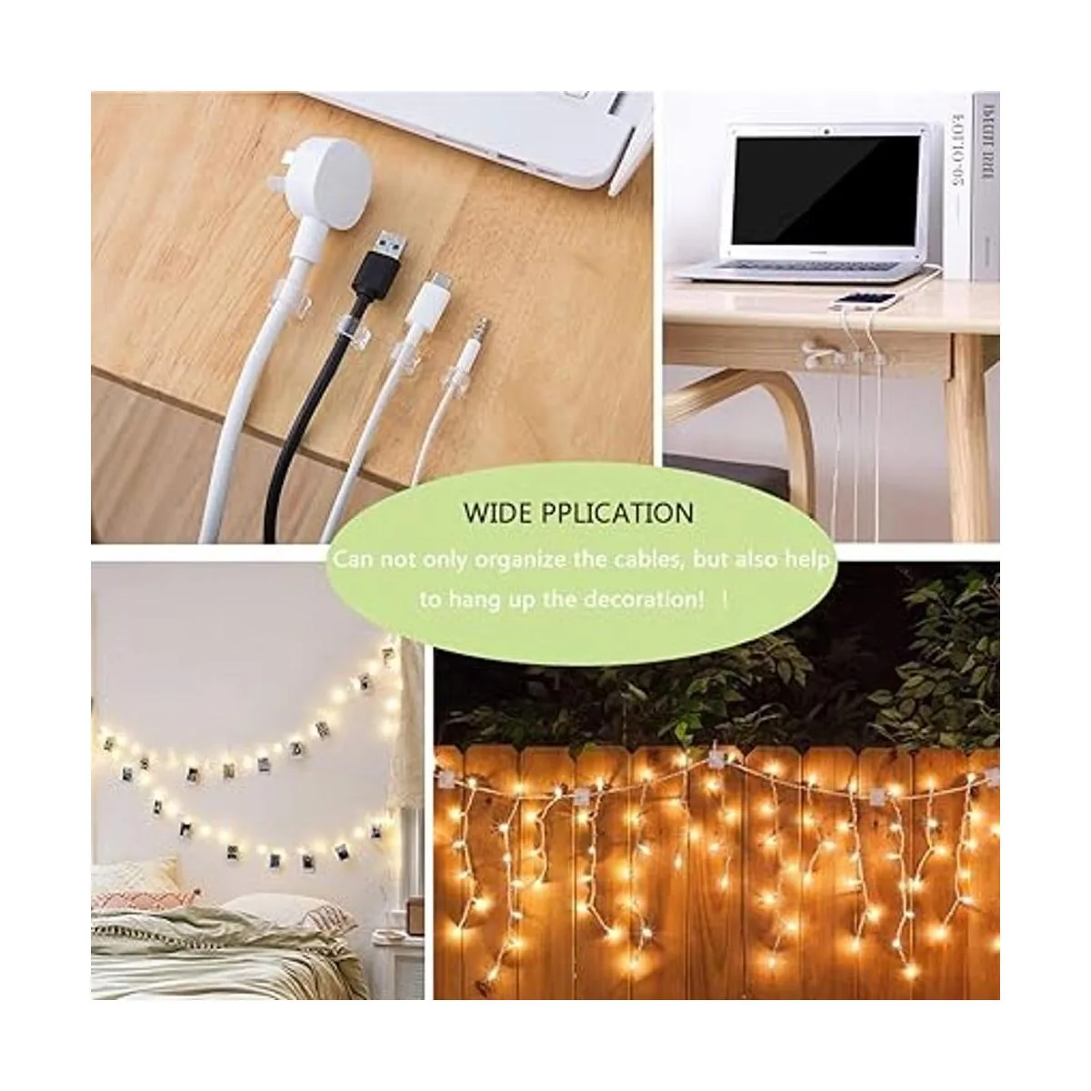 Clips de cable multiusos: los clips ordenados de cables satisfacen tus diversas necesidades de organización de cables; se utiliza para almacenar y gestionar diferentes tipos de cables: cables Ethernet, cables USB, cables HDMI, cables de enrutador, cables de TV, etc. Los ganchos de cable también pueden ayudarte a organizar y decorar fácilmente luces de Navidad, luces de hadas, adornos de Navidad, luces de cadena al aire libre. Ampliamente utilizado en el hogar, jardín, garaje y oficina.