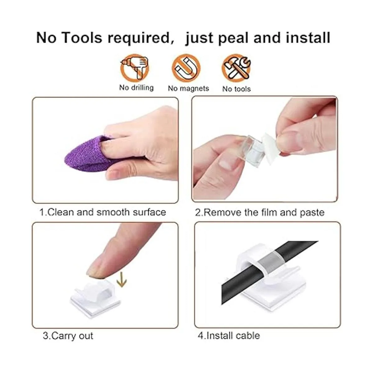 Clips de cable autoadhesivos: utiliza nuestras fuertes almohadillas adhesivas de doble cara, sin necesidad de taladrar, fácil de quitar, no deja residuos. Mantén la superficie limpia y seca cuando la utilices para garantizar la máxima adherencia. Fácil de instalar en diferentes superficies como mesas, paredes, plásticos, madera, vidrio, metal, etc.
