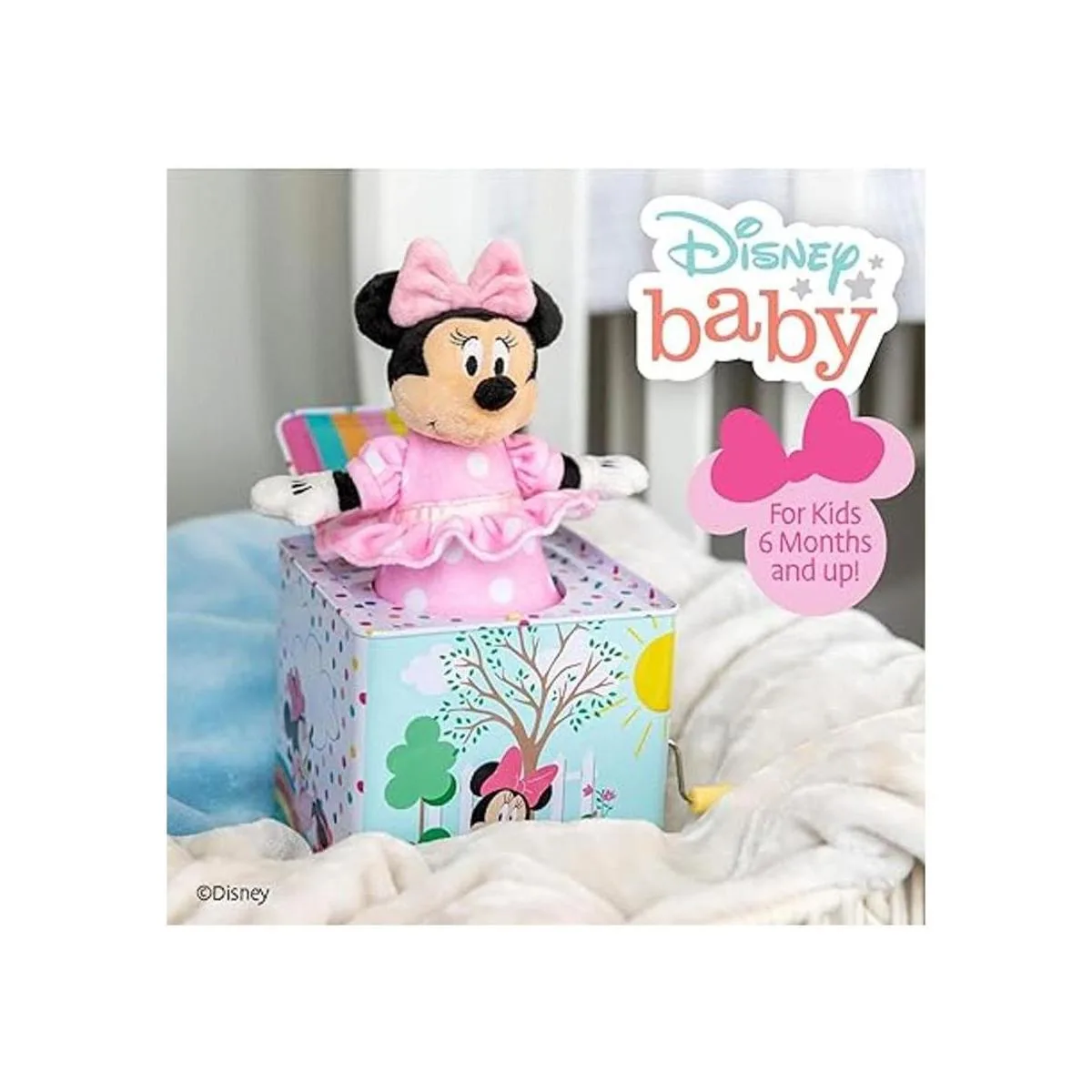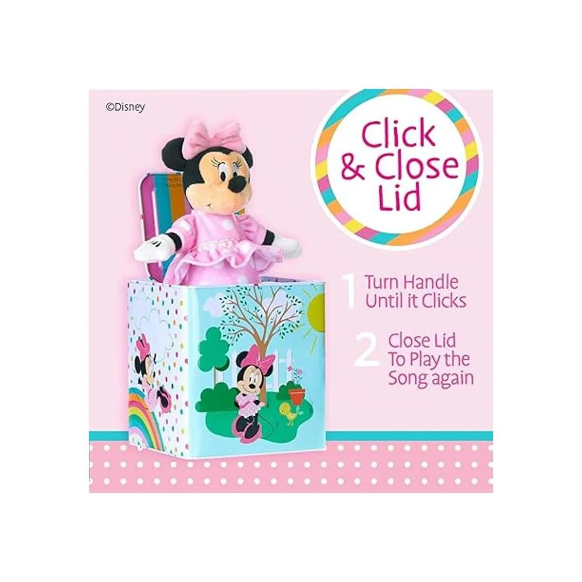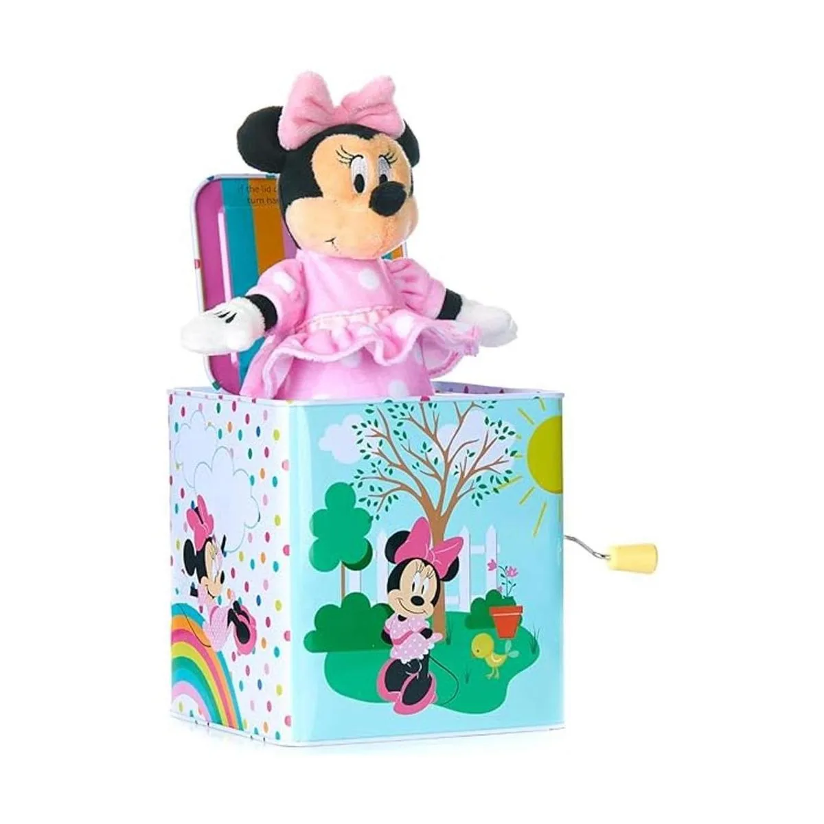 Diversión duradera: el juguete musical clásico Jack en la caja está hecho de metal duradero y resistente y una marioneta de felpa emergente. Con obras de arte de Minnie de Disney en su bonito vestido rosa.