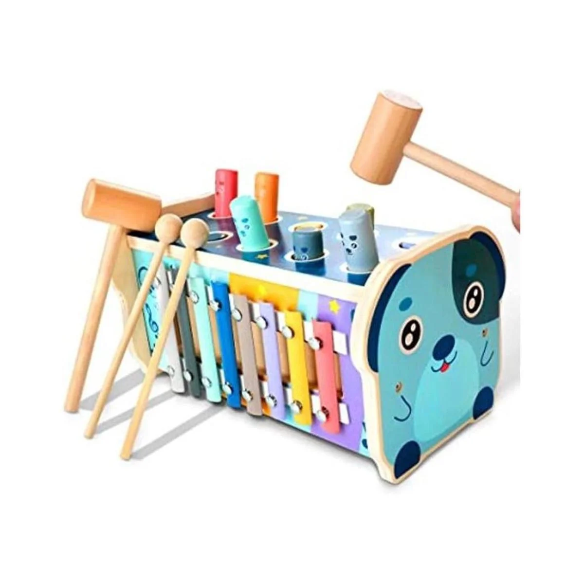 Juego de juguetes multifuncionales Este versátil juego de juguetes es un banco de golpeo clásico, xilófono musical y rompecabezas de laberinto de números, 3 en uno. Golpea las diez clavijas en el banco, los hámsters se despliegan hacia arriba y hacia abajo en turnos y muestra sus sonrisas traviesas. Dos martillos y mazos con rompecabezas de laberinto numérico en el otro lado permiten que dos o más niños compartan alegría juntos.