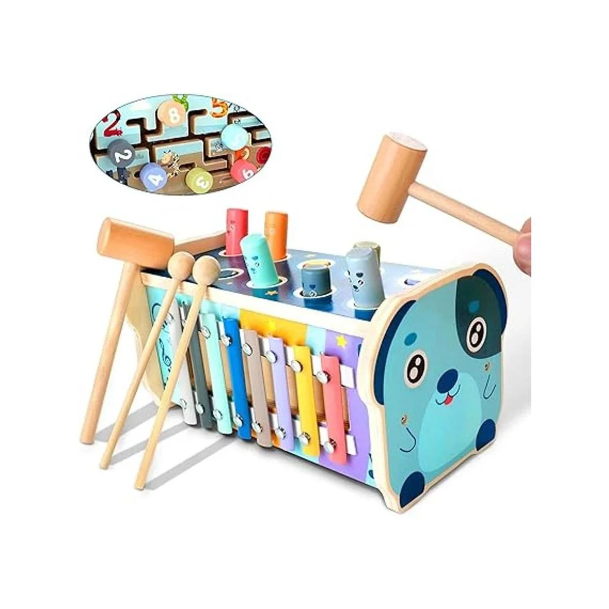 Educativo pero alegre: el acto de golpeo desarrolla la coordinación ojomano y las habilidades motoras finas, fortalece los músculos del brazo. La reproducción de xilófono de 8 notas fomenta el reconocimiento de audio y el desarrollo musical. Los rompecabezas de laberinto numérico ayudan con el reconocimiento de números y el entrenamiento cerebral