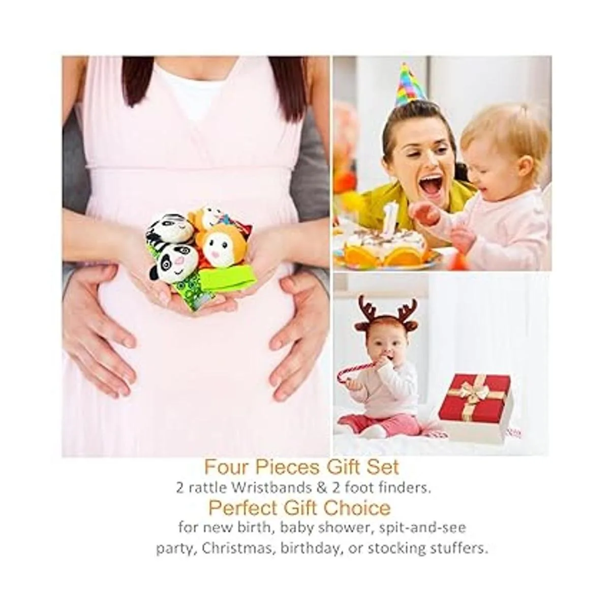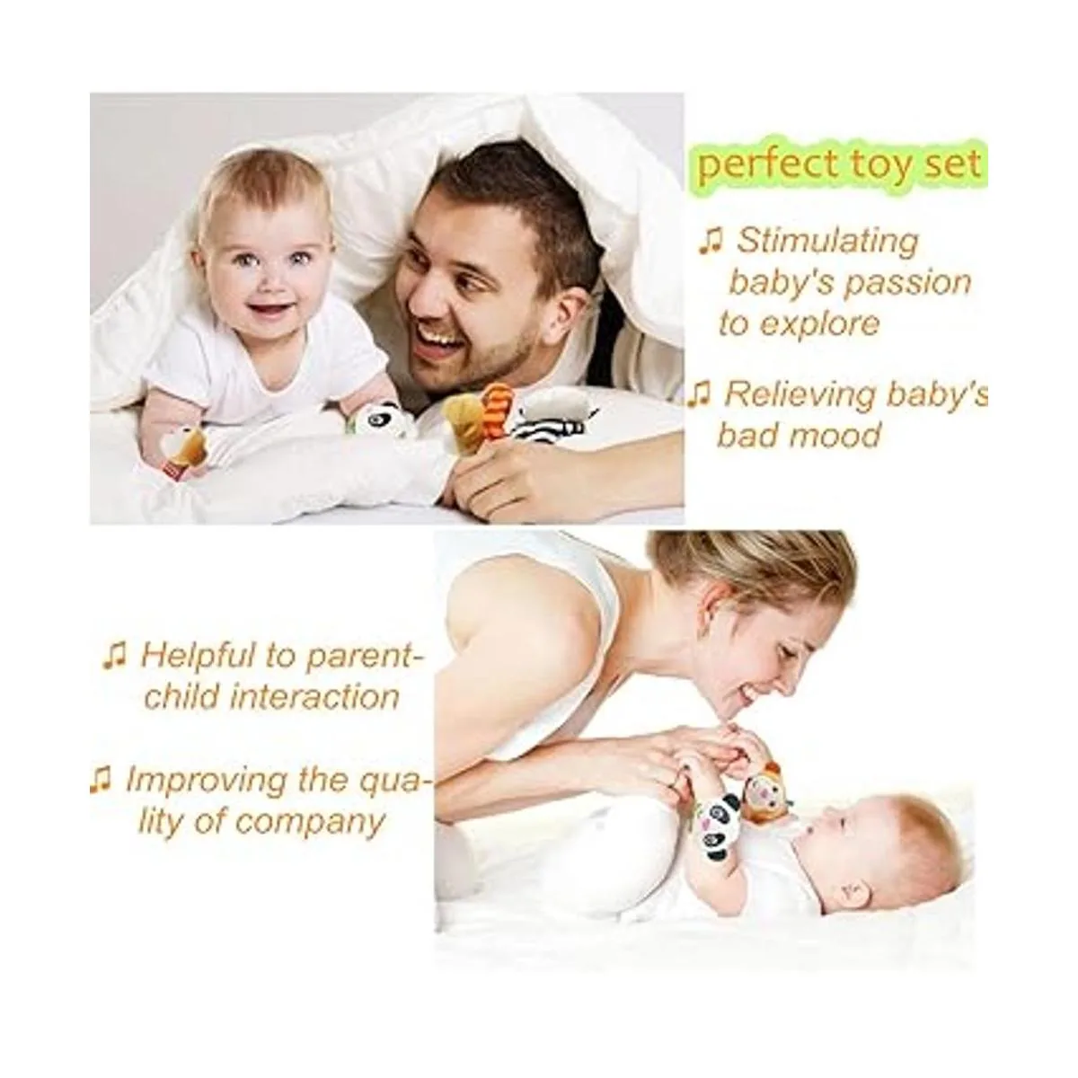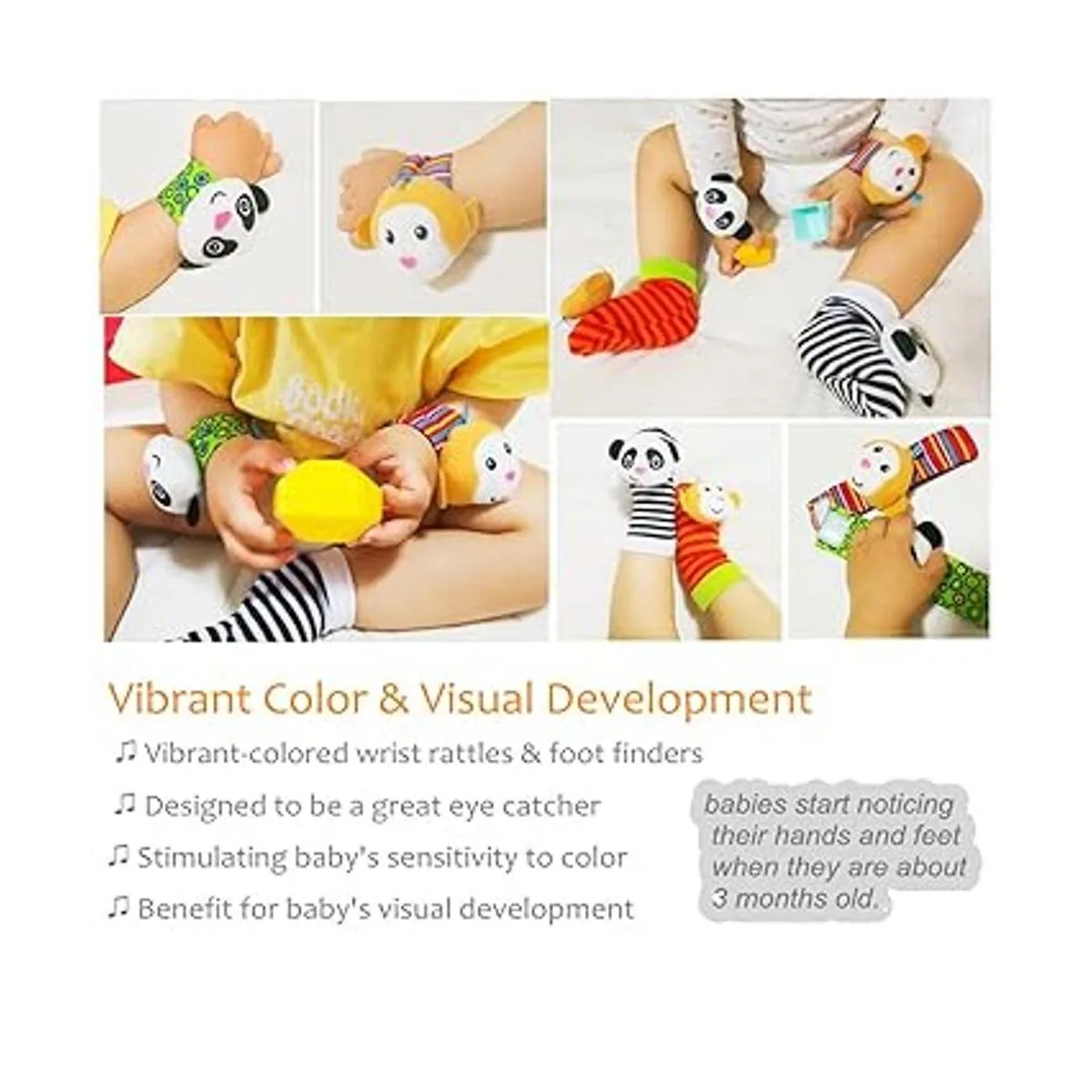 Desarrollo temprano: Es importante entrenar la vista y la audición de los bebés dentro de los primeros 2 meses de su nacimiento. Puedes mover o agitar este juego de juguetes alrededor de su cabeza para entrenar su capacidad de seguir el sonido y los objetos. Lleva este juguete en las muñecas y los pies del bebé, y haz que se rían balanceando suavemente sus brazos y piernas.
