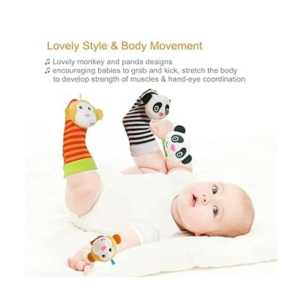 Bonito estilo y movimiento corporal: funciona como un juguete de gimnasio. Los encantadores animales de peluche animarán a tu bebé a agarrar y patear, estirar su cuerpo para tocarlo. En el proceso, pueden desarrollar su fuerza de músculos y coordinación ojomano. Color vibrante y desarrollo visual: los sonajeros de muñeca y los sonajeros de pies de colores vibrantes son llamativos y estimularán la sensibilidad del bebé al color y beneficiarán el desarrollo de la visión del bebé.
