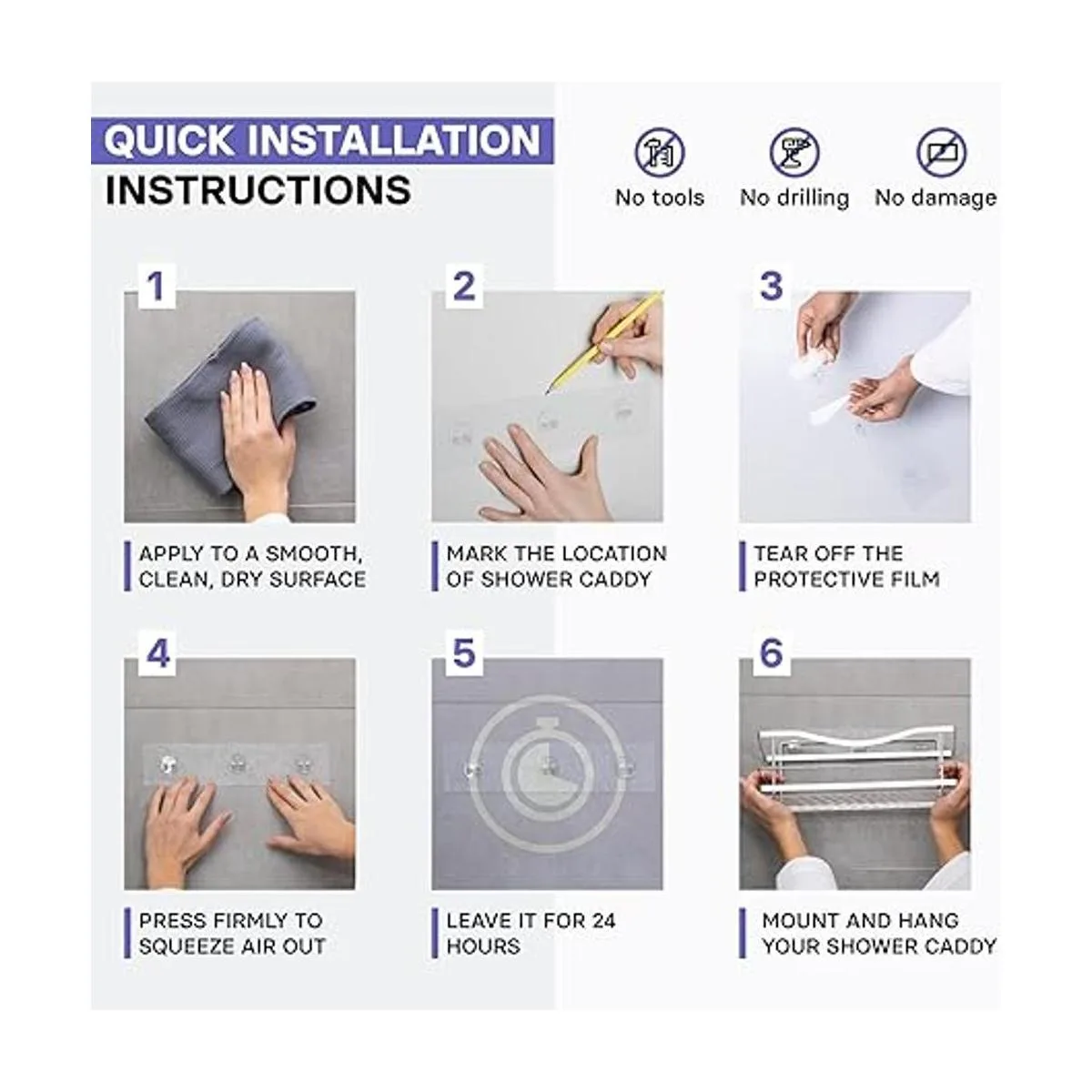 Easy Installation 4 easy steps to improve your shower experience: clean the surface, peel off the cover, apply the adhesive and hang the shower caddy onto it without causing any damage to the wall