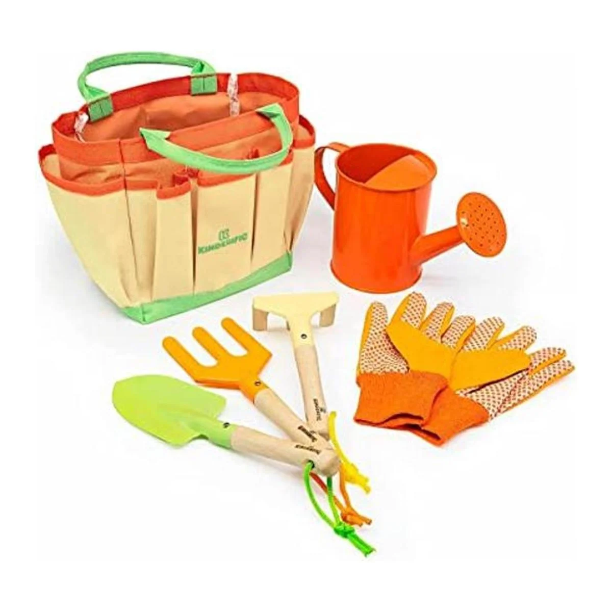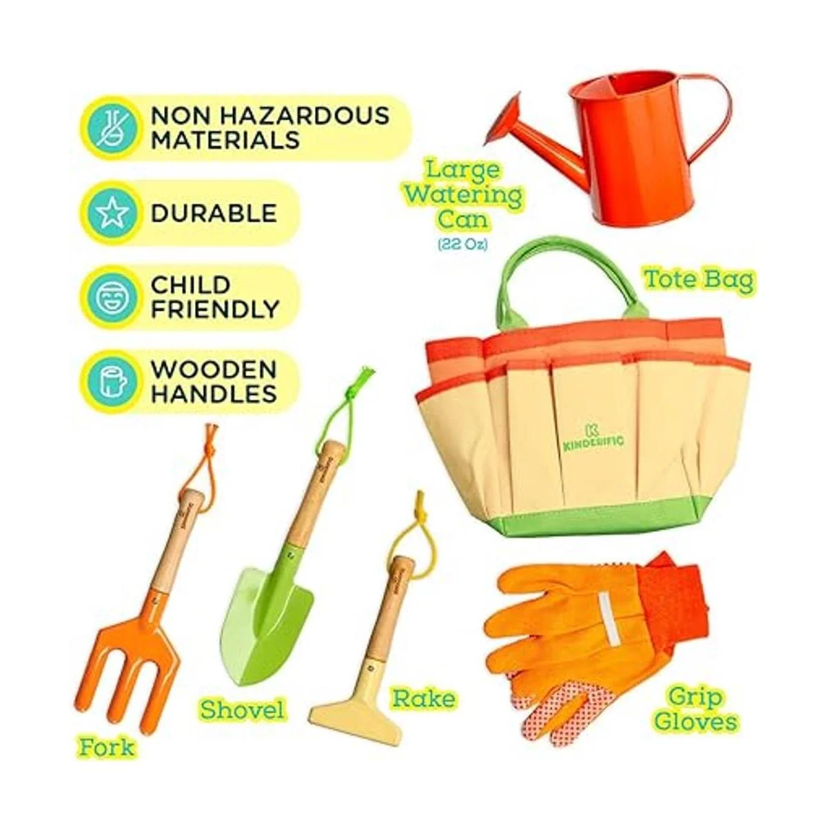 Kinderific Juego de jardinería, kit de herramientas, para niños pequeños y niños de 2 años en adelante, STEM, incluye bolsa de mano, pala, regadera, rastrillo, tenedor, paleta y guante amarillo pálido