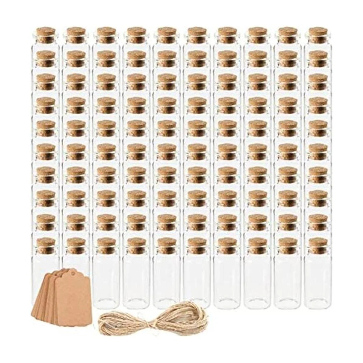 El juego incluye 100 botellas de vidrio con corchos, 100 etiquetas de papel kraft y cordel de 65.6 ft, se puede utilizar para una variedad de estilos o diseños.