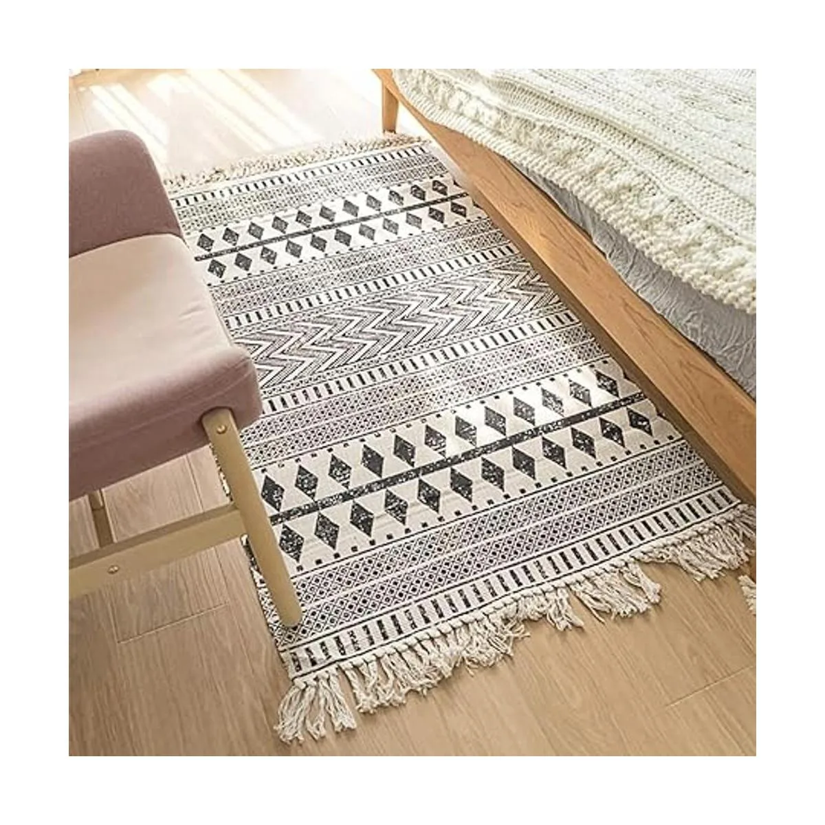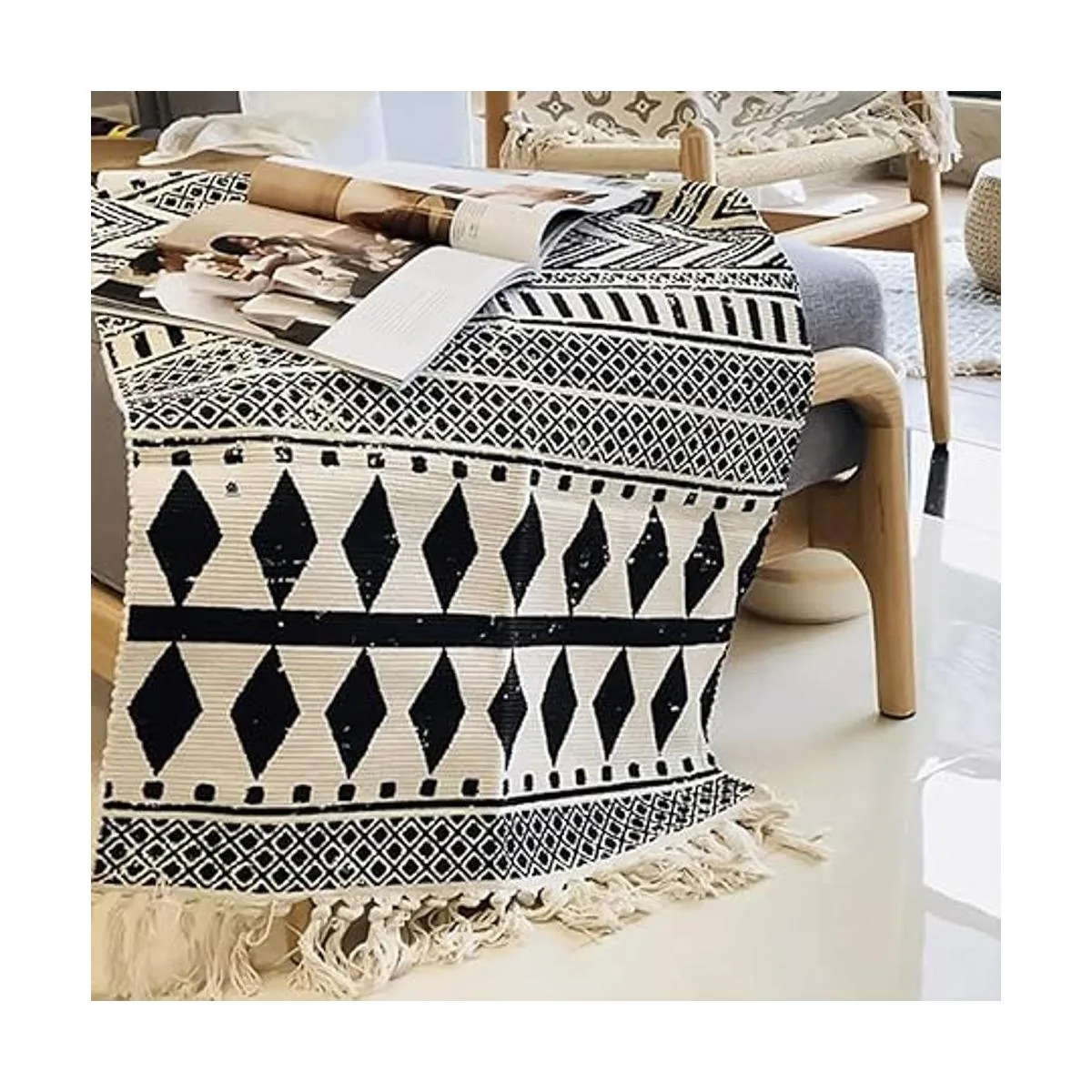 Hecho de una mezcla de algodón, poliéster y viscosa, cuenta con un patrón geométrico con borde de borlas.