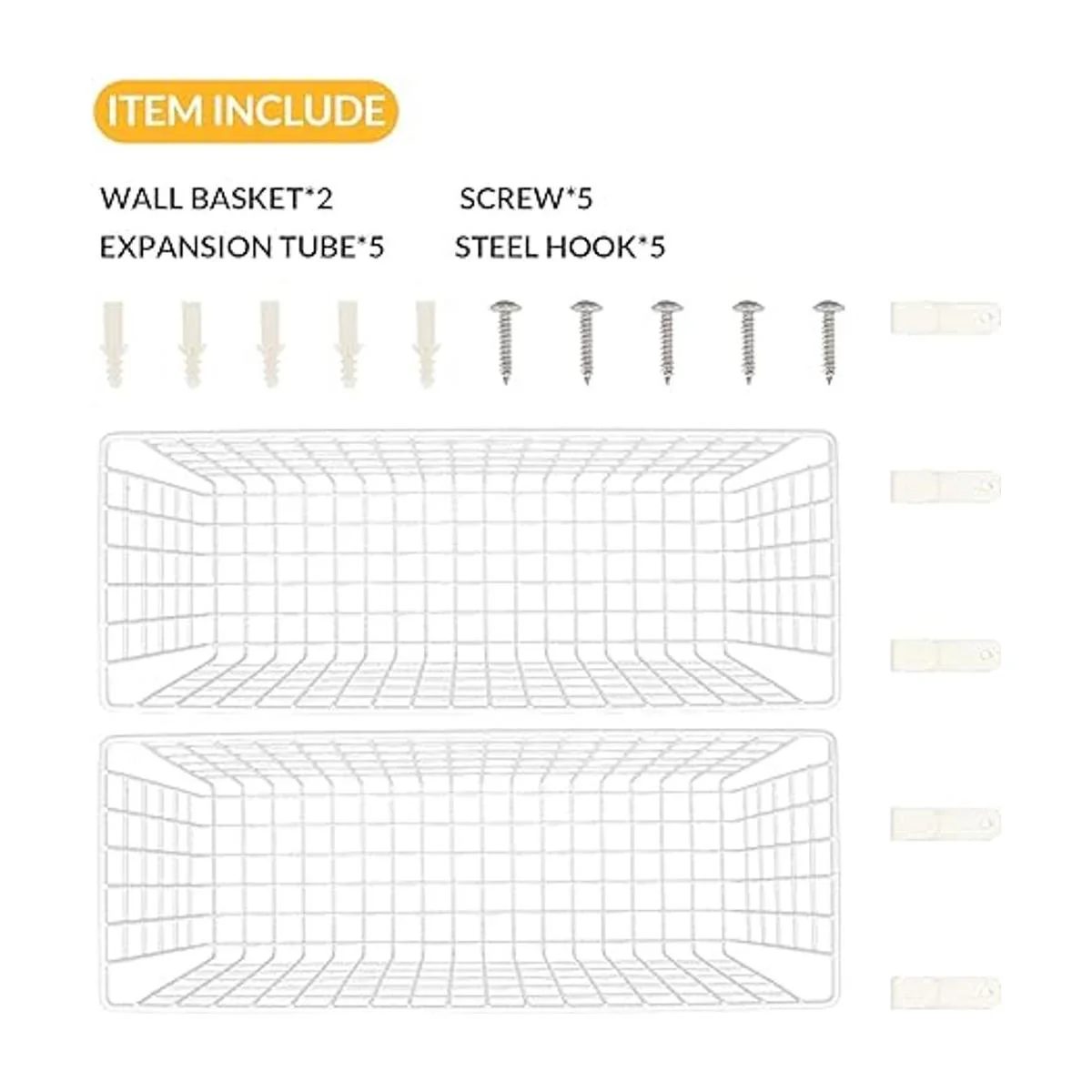Fácil de instalar: 2 cestas colgantes para organizar con juego de accesorios de montaje 5 ganchos de acero 5 tubos de expansión 5 tornillos. Coloca el soporte de ganchos en la pared con tubos de expansión y tornillos incluidos, luego simplemente cuelga la cesta y ya estás listo para usar.