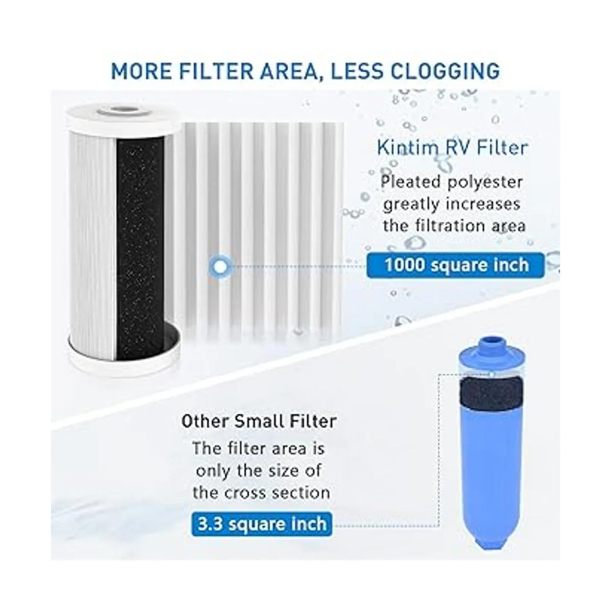Diseño antibloqueo: el diseño de poliéster plisado aumenta en gran medida el área del filtro a 1000 pulgadas cuadradas, lo que hace 256 veces más que los pequeños filtros de agua de RV, un cartucho puede filtrar al menos 18000 galones de agua sin obstrucción