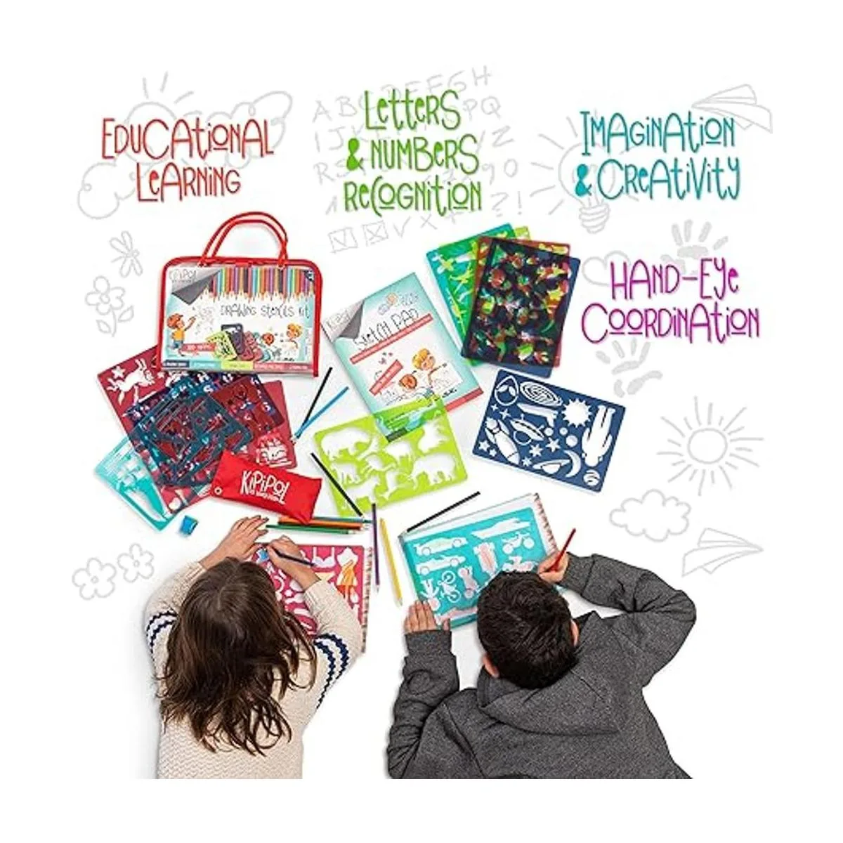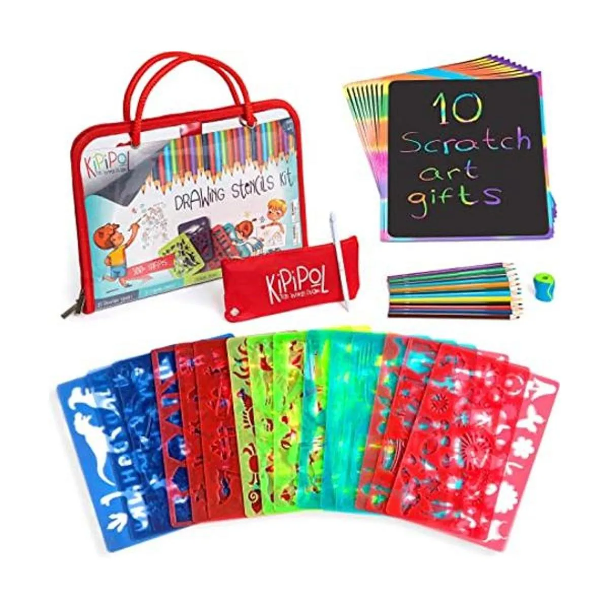 Kipipol Kit de plantillas de dibujo para niños a partir de 4 años, artes y manualidades para niñas y niños, juego de arte para colorear de 63 piezas, 15 plantillas, más de 260 diseños y arte para rascar, juguete educativo, regalo de creatividad