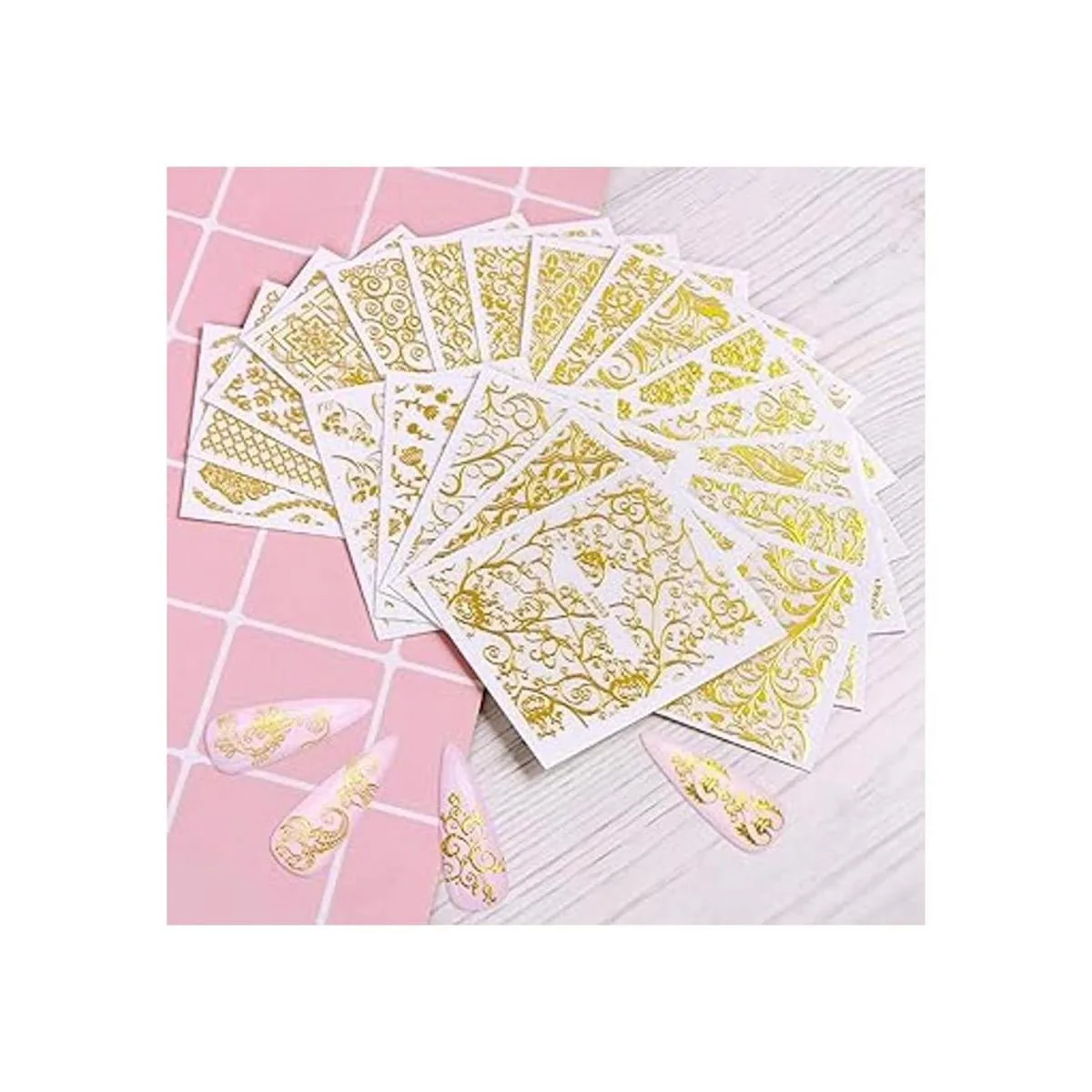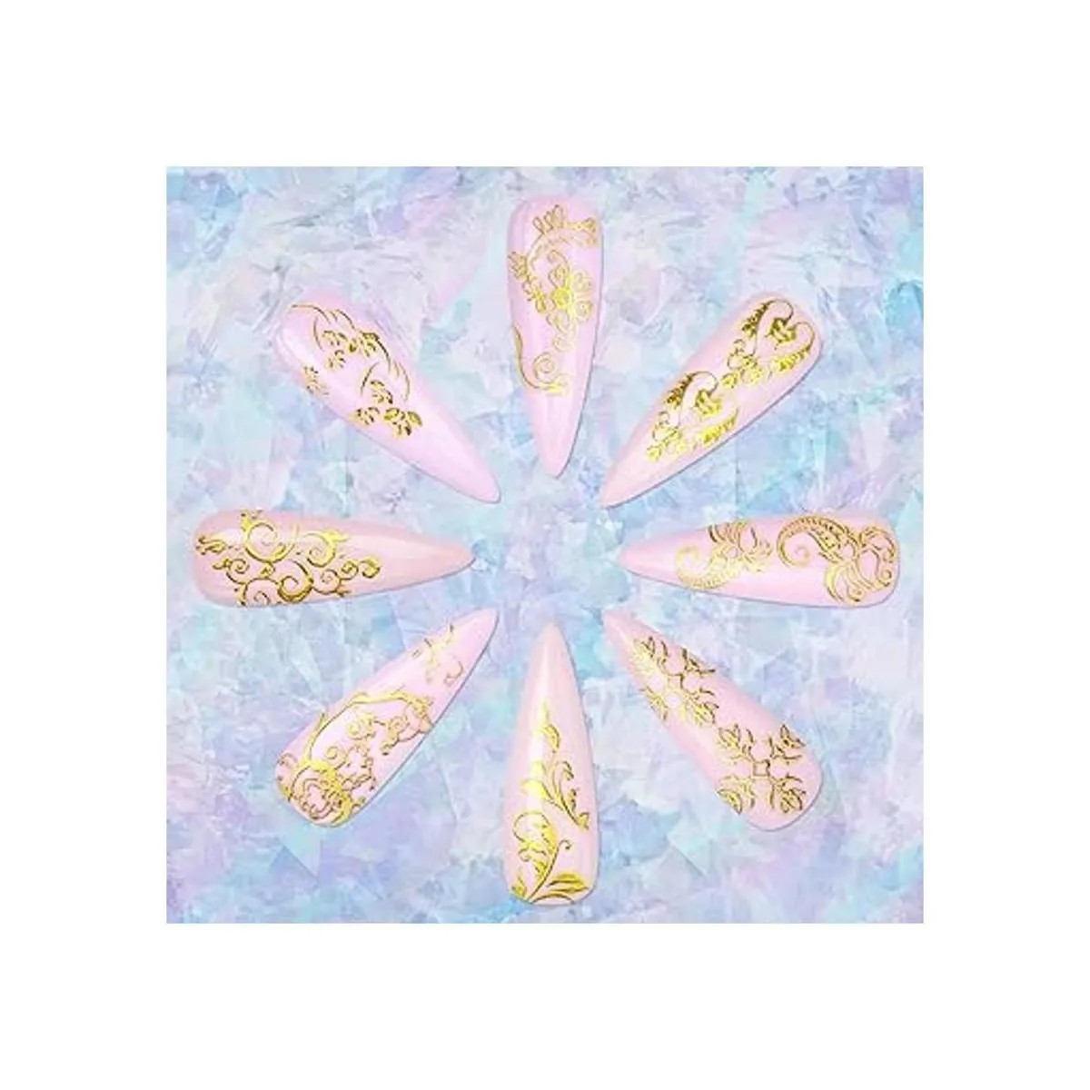 Buena calidad: las pegatinas de decoración de uñas con flores doradas están hechas de material de buena calidad, fácil de quitar. Con la aplicación adecuada, puedes conseguir tus uñas encantadoras en casa.