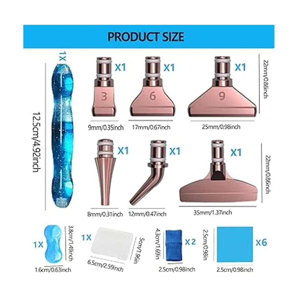 Todo lo que necesitas incluido: recibirás 6 bolígrafos de metal de repuesto 1 punta de metal, 1 punta de codo, 1 punta correctiva, 1 punta de taladro de 3/6/9, 1 exquisito bolígrafo de pintura de diamantes, 1 soporte para bolígrafos, 6 arcillas de pegamento, un paquete de anillos de goma de repuesto, 2 protectores de mangas de dedos, una caja de almacenamiento. Diferentes modelos de punta pueden perforar diferentes números de diamantes, conveniente y eficiente, lo que puede satisfacer fácilmente tus necesidades de bricolaje.