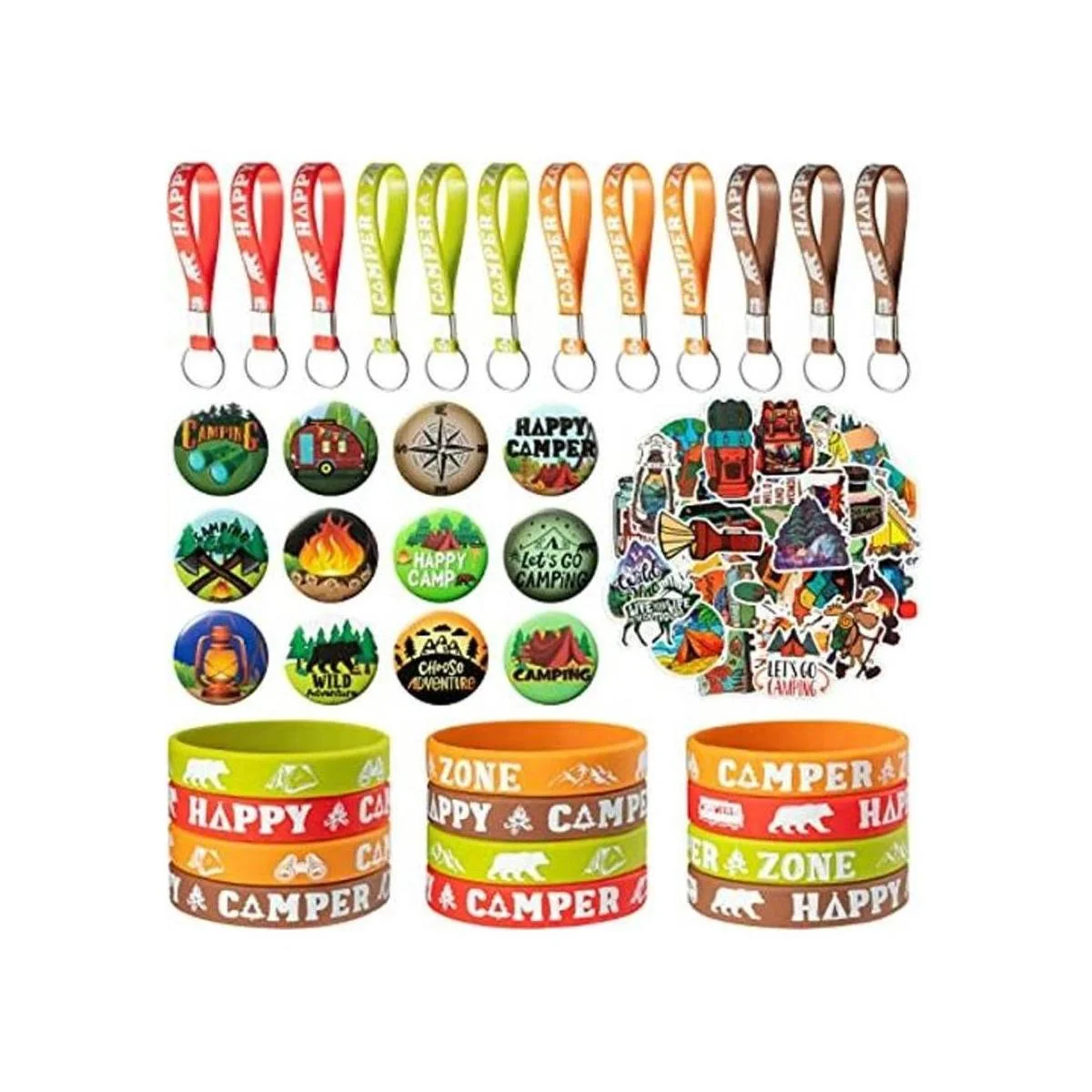 Kit de 84 recuerdos de fiesta de campamento, regalos de fiesta de campistas felices incluyen pulseras de silicona, calcomanías, llavero, insignia para niños, campamento, aventura, fiesta de cumpleaños