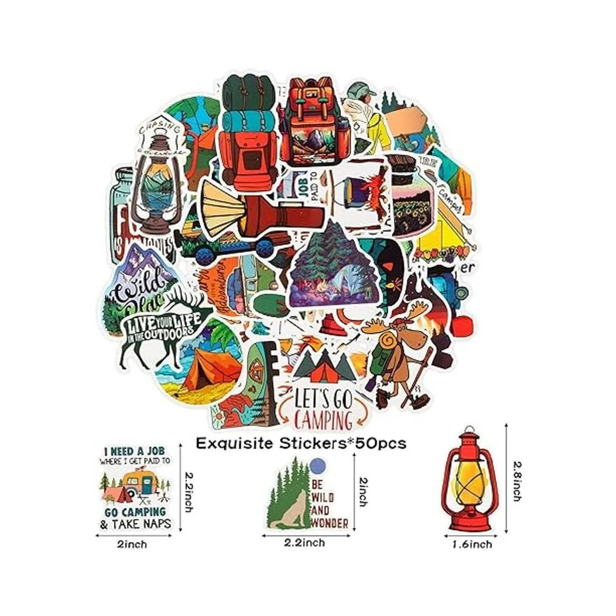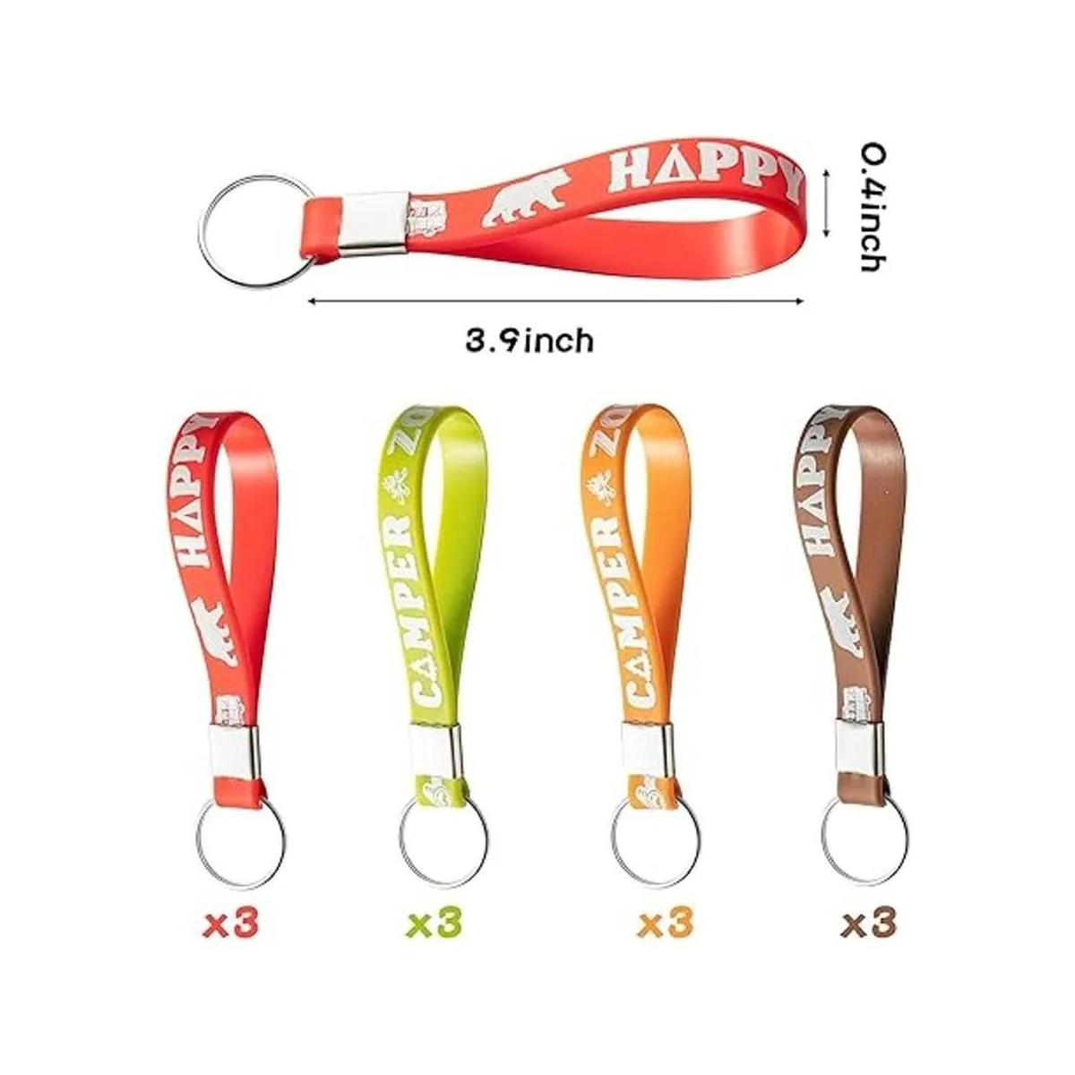 Lo que obtienes: 12 pulseras de silicona para camping, 12 llaveros de camping, 12 insignias de camping, 50 calcomanías de camping