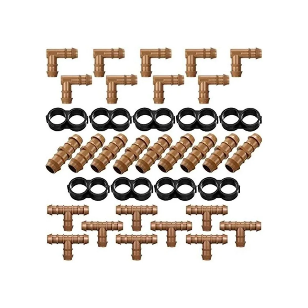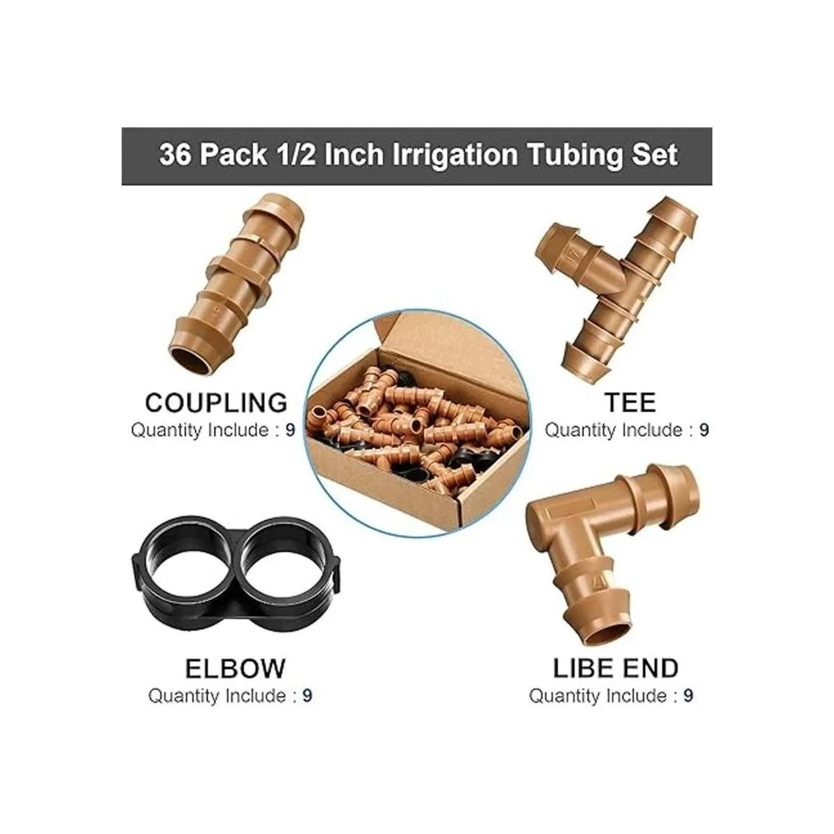Kit de accesorios de riego por goteo de 36 piezas, juego de accesorios de tubería de 12 pulgada, incluye 9 camisetas, 9 acoplamientos, 9 codos y 9 tapones de tapa de extremo, conectores de púas de riego por goteo para sistemas compatibles de goteo o aspersor