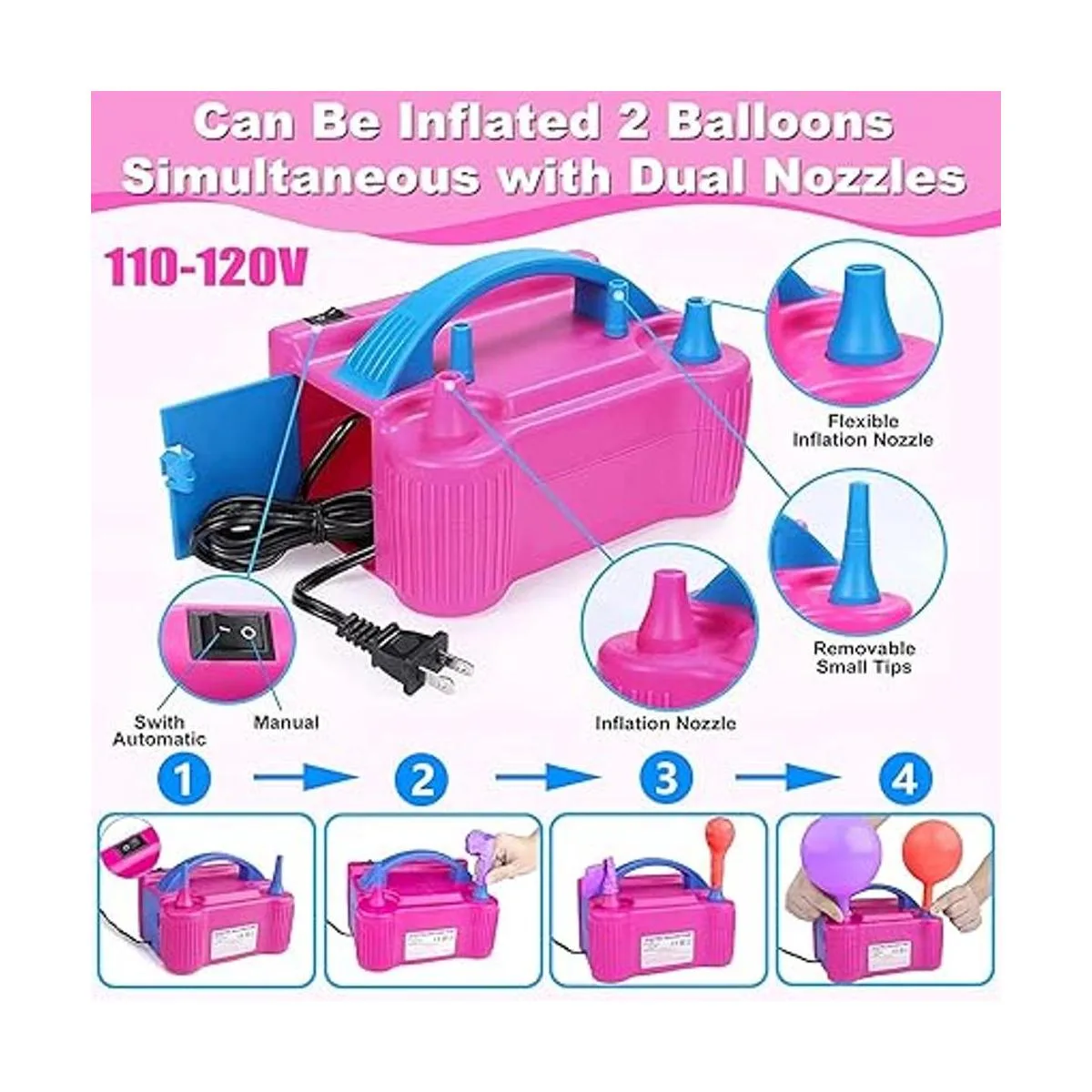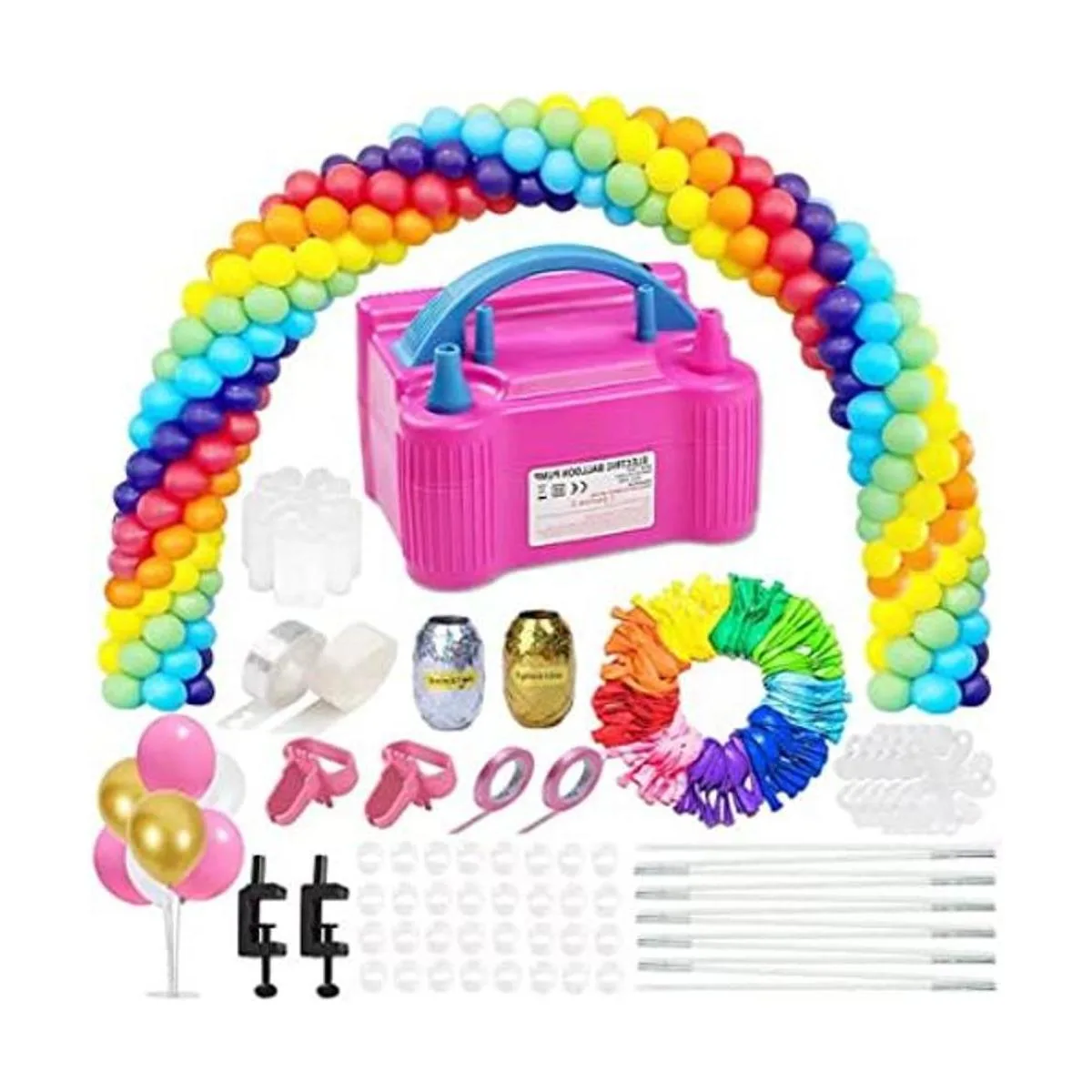 Kit eléctrico completo para globos: nuestro inflador de aire eléctrico incluye todo lo que necesitas para tus fiestas. Incluye 1 parachoques eléctrico para globos, 1 kit de arco de globos de mesa de 12 pies, 1 soporte para globos, 100 globos coloridos, 25 broches de globo, 2 clips ajustables, 20 clips de flores, 4 cintas de colores, 2 herramientas de atado, tira de cinta de 32.8 ft, pegamentos de puntos de 32.8 ft 100 puntos.