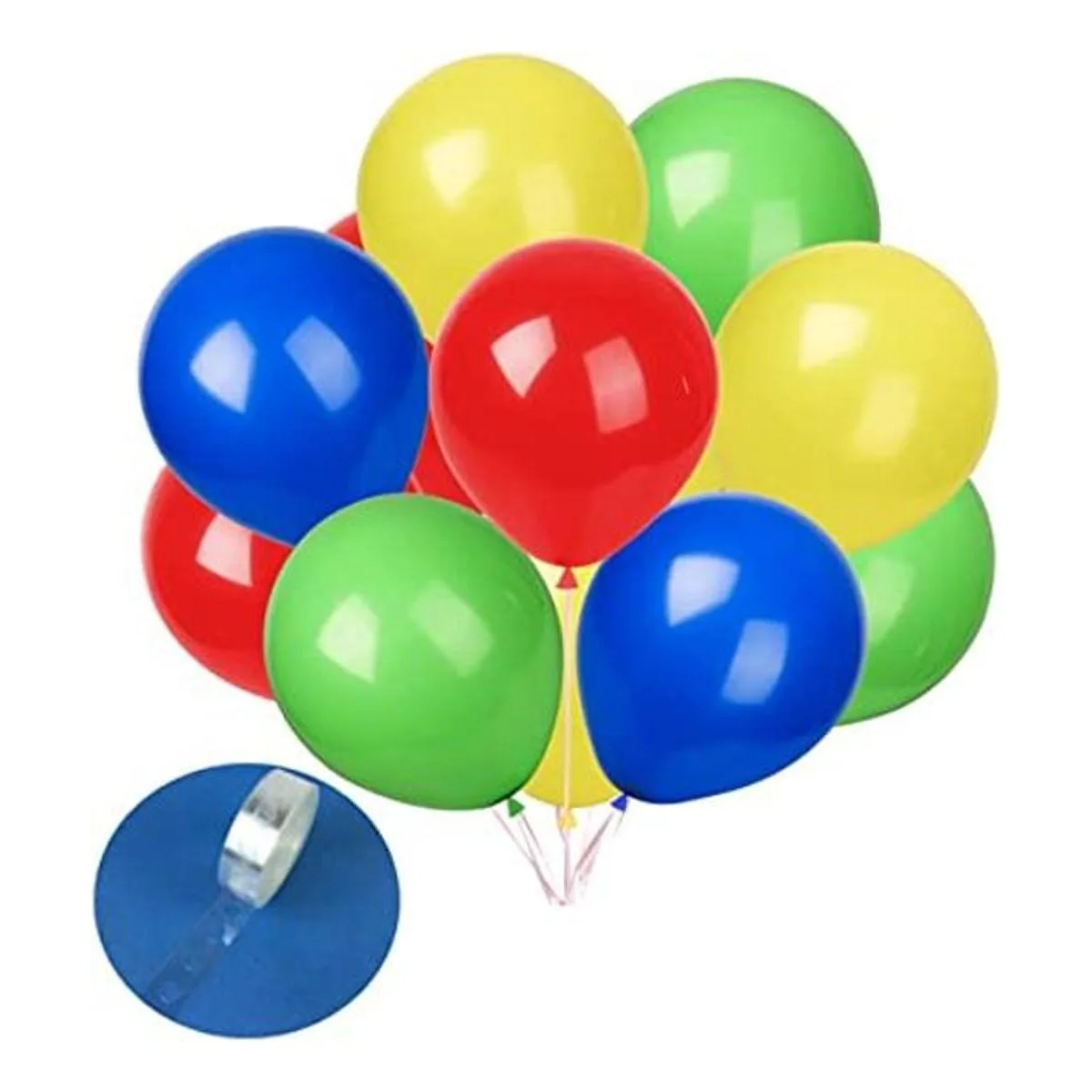 El paquete incluye: 100 globos de látex 25 piezas rojas, 25 piezas verdes, 25 piezas azules, 25 piezas amarillas, 1 cadena de globos de 16.5 pies