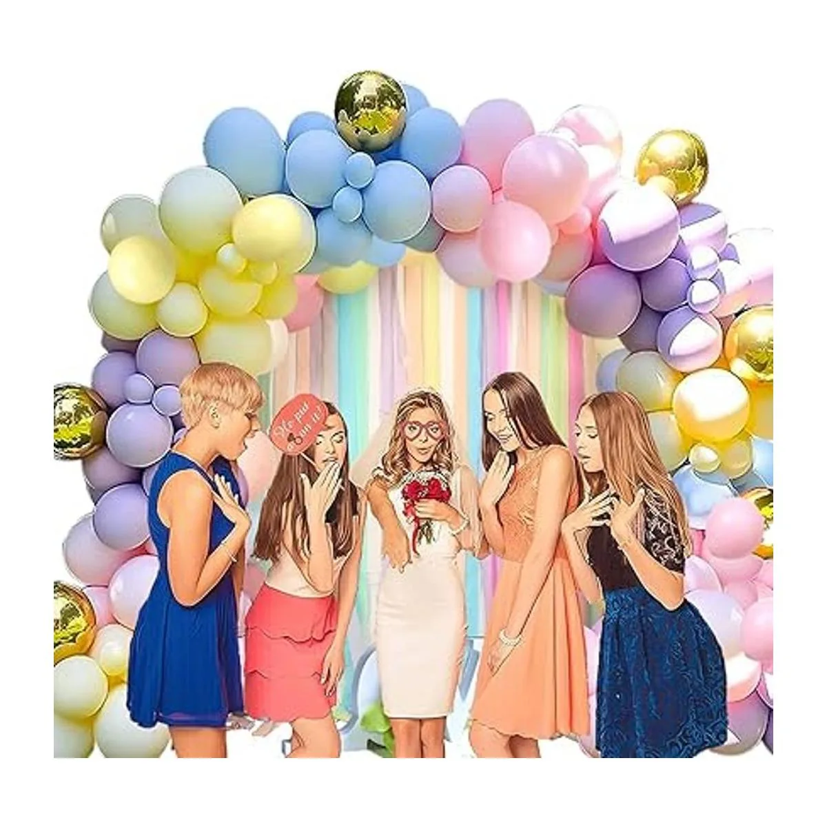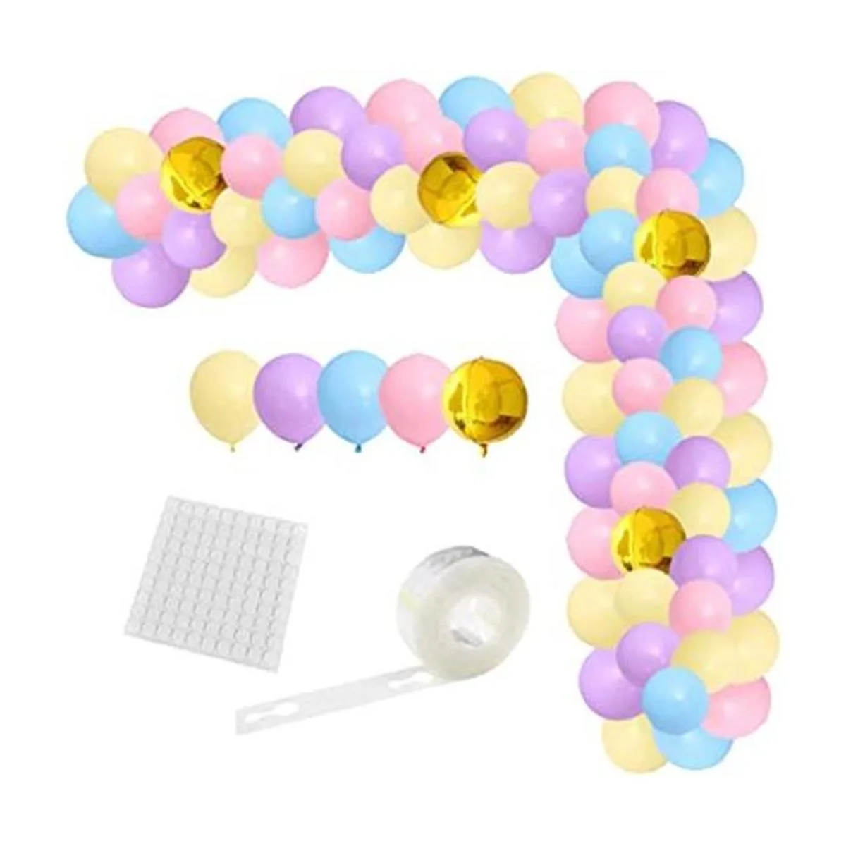 Guirnalda de globos de arco iris: globo macaron de 5 pulgadas rosa, 10 amarillo, 10, azul, púrpura, 10, globo macaron de 10 pulgadas rosa, 10, amarillo, 10, azul, púrpura, 10, globo macaron de 12 pulgadas rosa, 10, amarillo x 10, azul. 10, púrpura, 10, 10, globos 4D de lámina dorada de 10 pulgadas, 6 unidades, 1 rollo de cinta plateada 32.8 ft, 1 adhesivo de doble cara 100 puntos, 1 rollo de cadena de globos de doble agujero 16 pies.