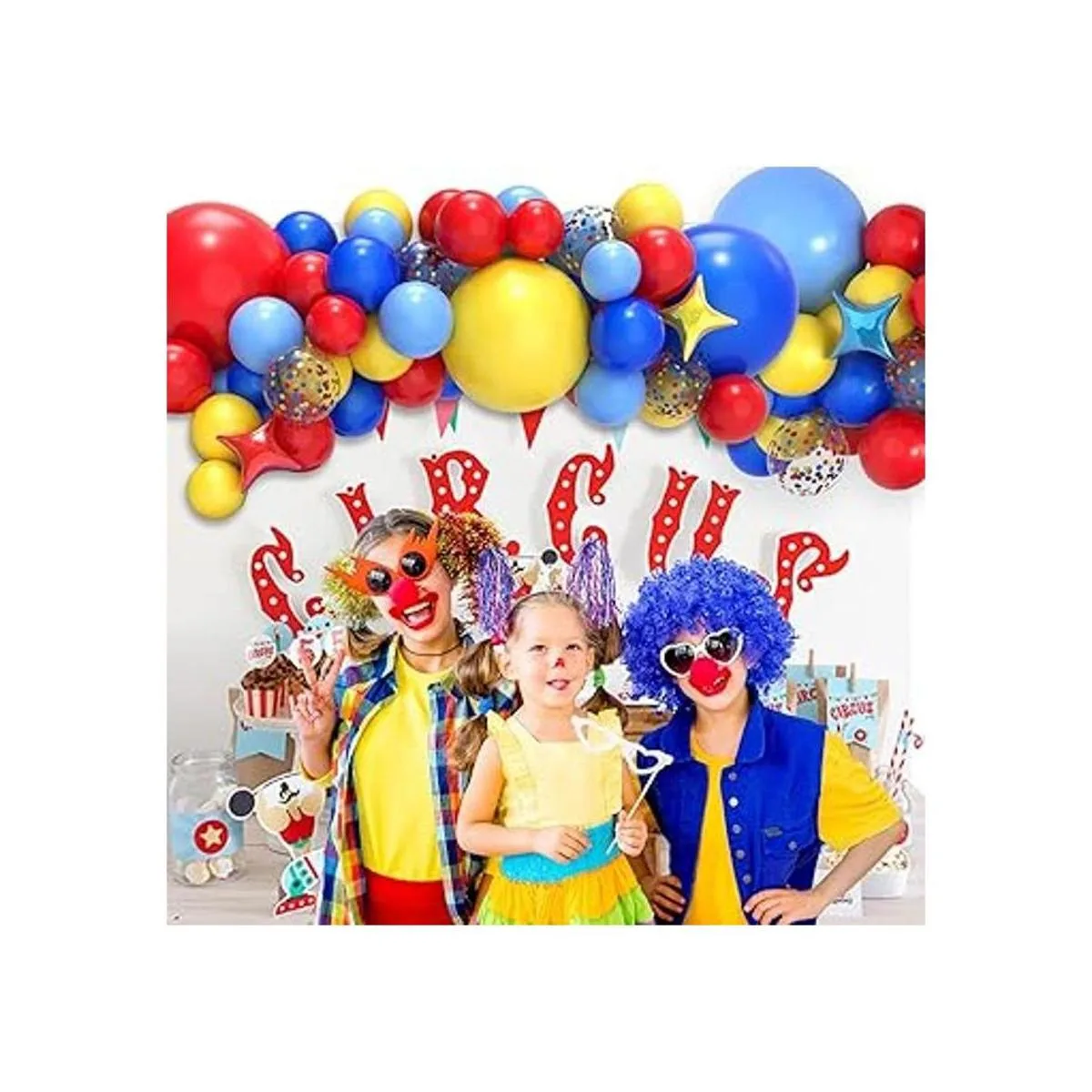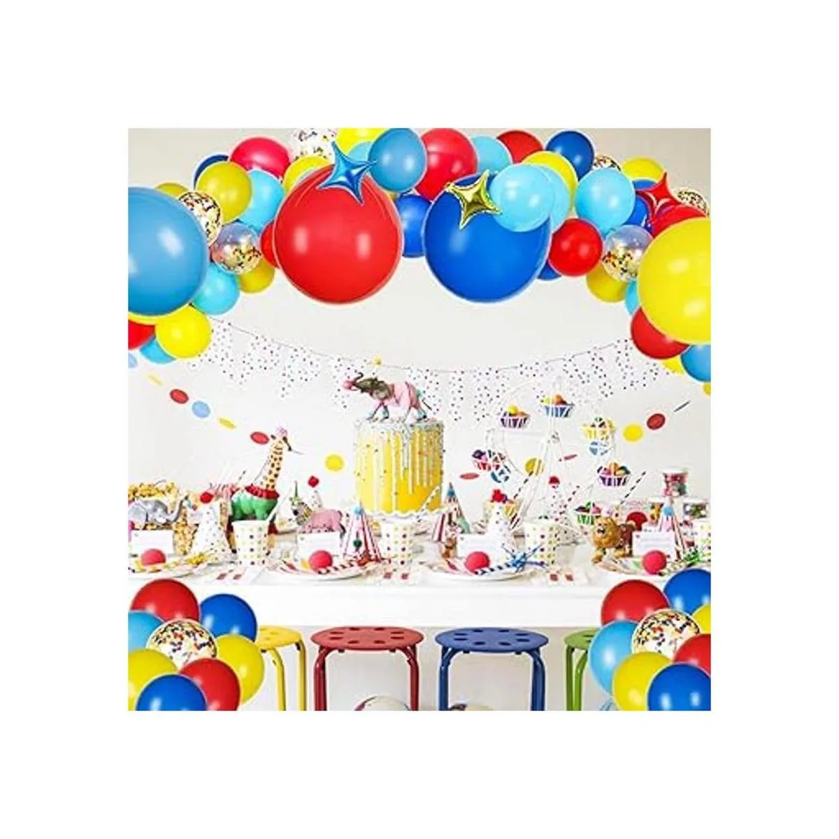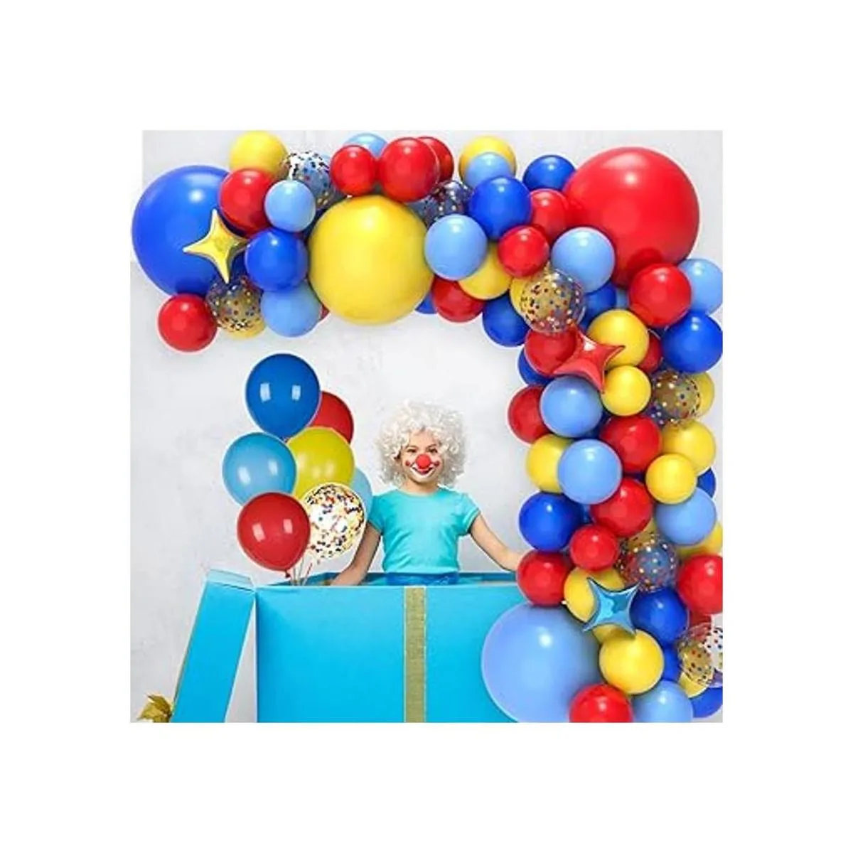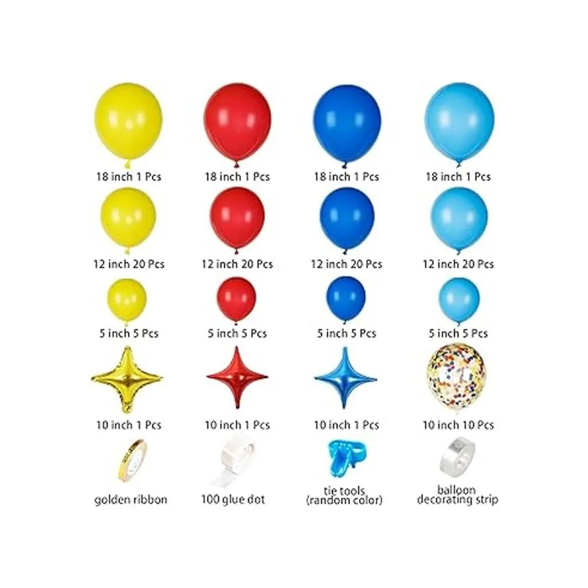 Decoraciones de fiesta temática de carnaval incluyen Un total de 117 globos de circo, 18 pulgadas, 12 pulgadas, 5 pulgadas, amarillo, rojo, azul real, azul claro mate 26 por color, 10 globos de confeti arcoíris de 12 pulgadas, globos de aluminio de cuatro puntas de 10 pulgadas, rojo/amarillo/azul 3 en total, 1 paquete de cinta dorada, 10000 puntos de pegamento, 100 puntos de pegamento, 100 piezas de pegamento herramientas de anudado, a Paquete de tira de guirnalda de globos. El paquete llegará sin inflar.