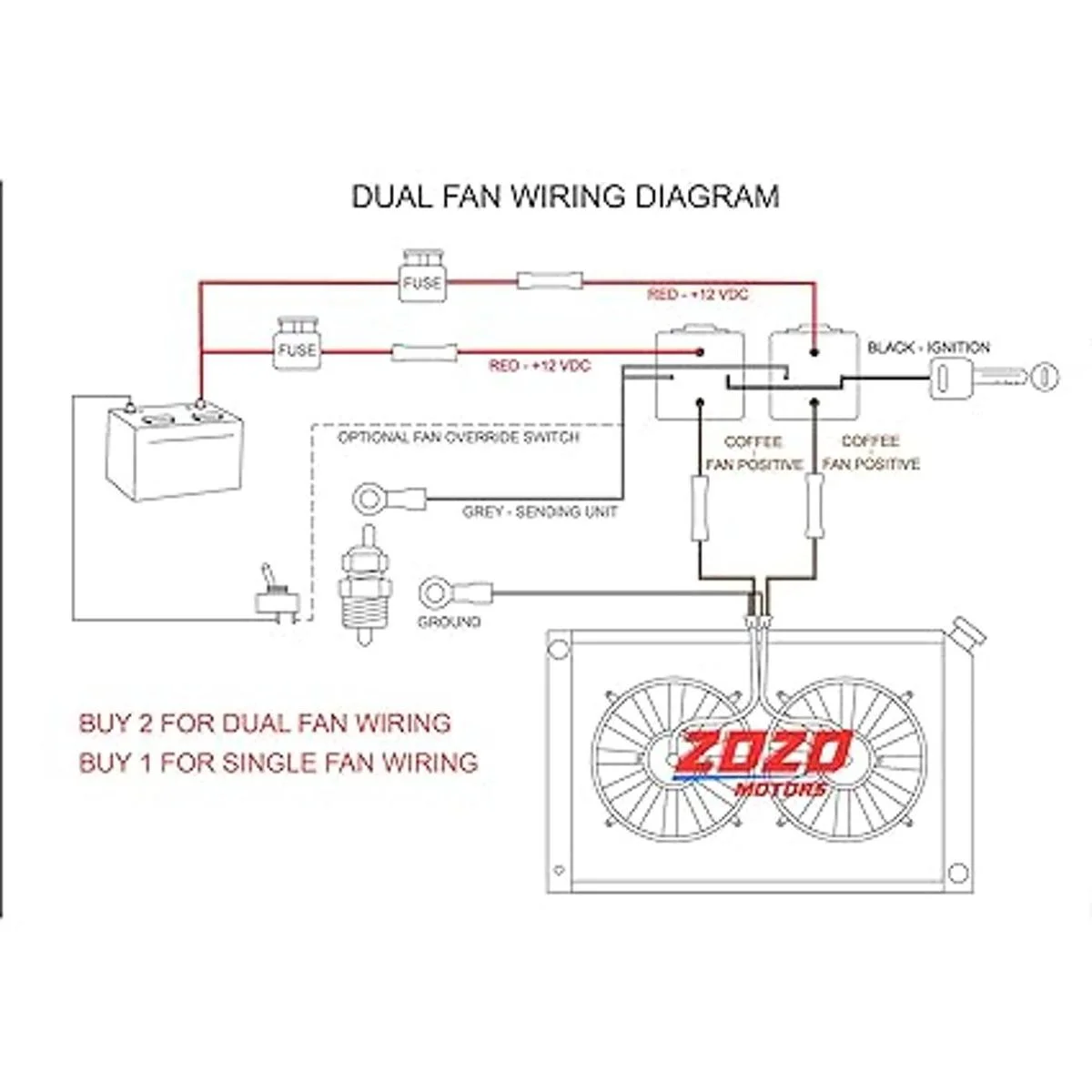 Diagrama de cableado fácil de seguir que simplifica el cableado de tus ventiladores eléctricos. Terminal de batería positivo rojo a 12 V CC, CAF a ventilador positivo, negro a encendido, gris a unidad de envío por diagrama de cableado. La pieza de repuesto directa se adapta a ventiladores de refrigeración de 10, 12, 14 y 16 pulgadas. Para el cableado de doble ventilador, necesitarás dos de este kit de relé