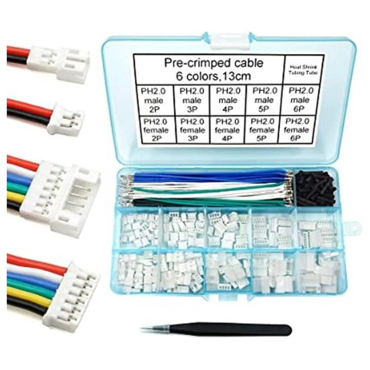 Este kit incluye conector hembra y macho PH2.0.000 in 2/3/4/5/6 pines, 90 cables preengarzados, tubo termorretráctil y 1 pinza. Es perfectamente compatible con conector JSTPH2.0