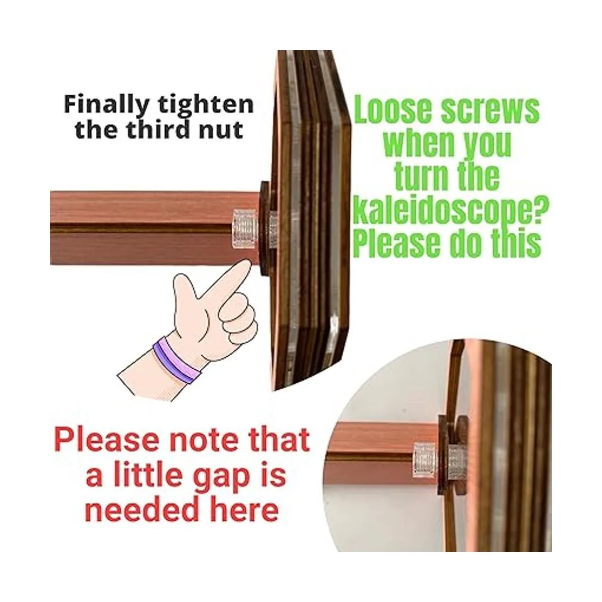 Fácil de usar Por favor, mira el video primero antes de instalar. Fácil de instalar, simplemente utiliza tornillos para conectar el cilindro y el prisma manualmente. Llena el caleidoscopio con tu imaginación, gira el barril y disfruta de tu propia creación de patrones de color que atraerán a los niños de todas las edades.
