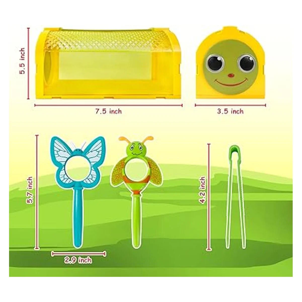 La funda mide 7.5 pulgadas de largo, 5.5 pulgadas de altura. 3.5 pulgadas de ancho. La jaula de insectos es pequeña y lo suficientemente portátil para las manos de los niños pequeños